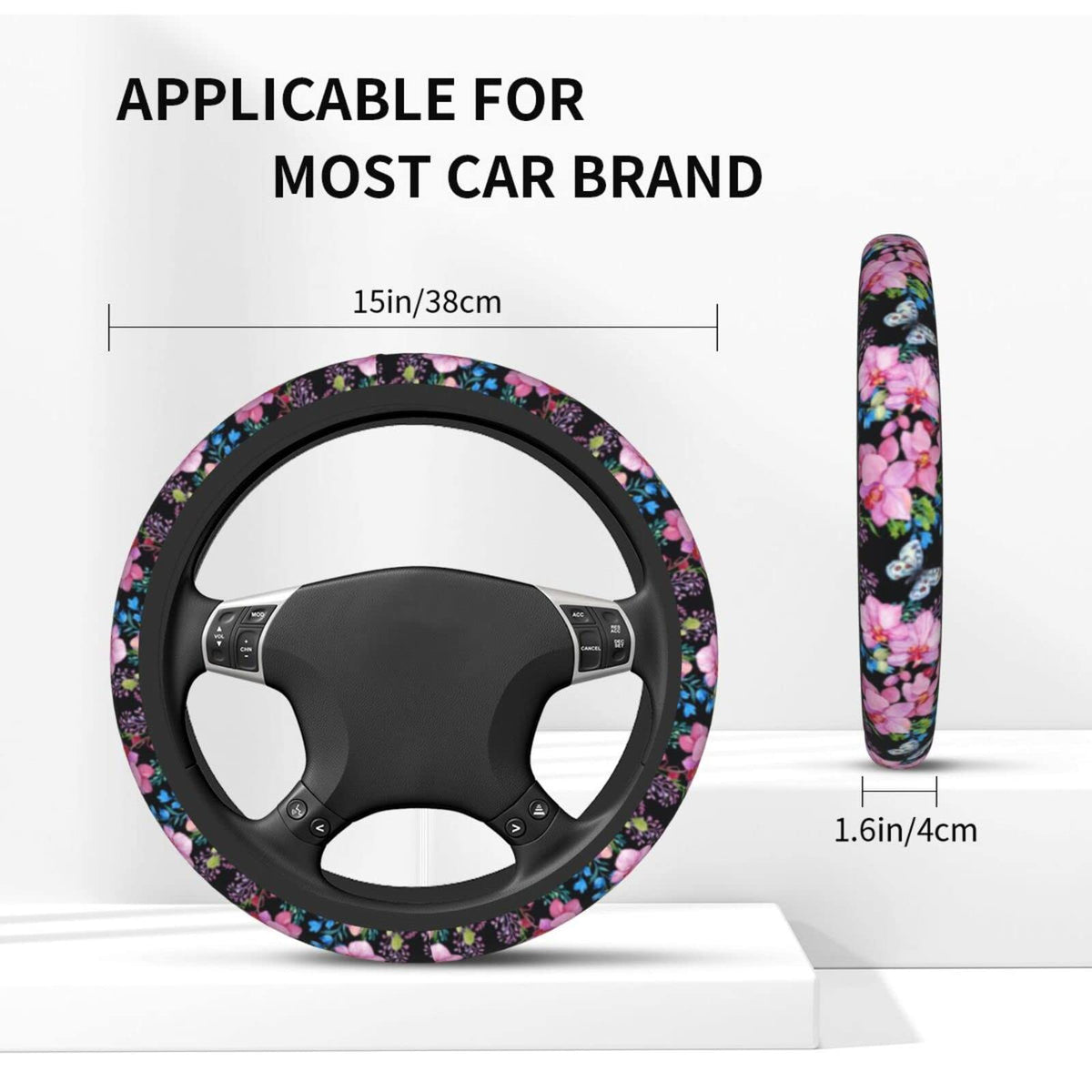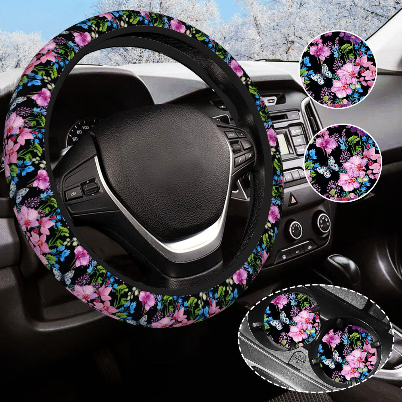 Beautiful Butterfly Steering Wheel Cover for Women Men with 2 Pcs Car Coasters, Universal 14.5-15 Inch Flowers Steering Wheel Co