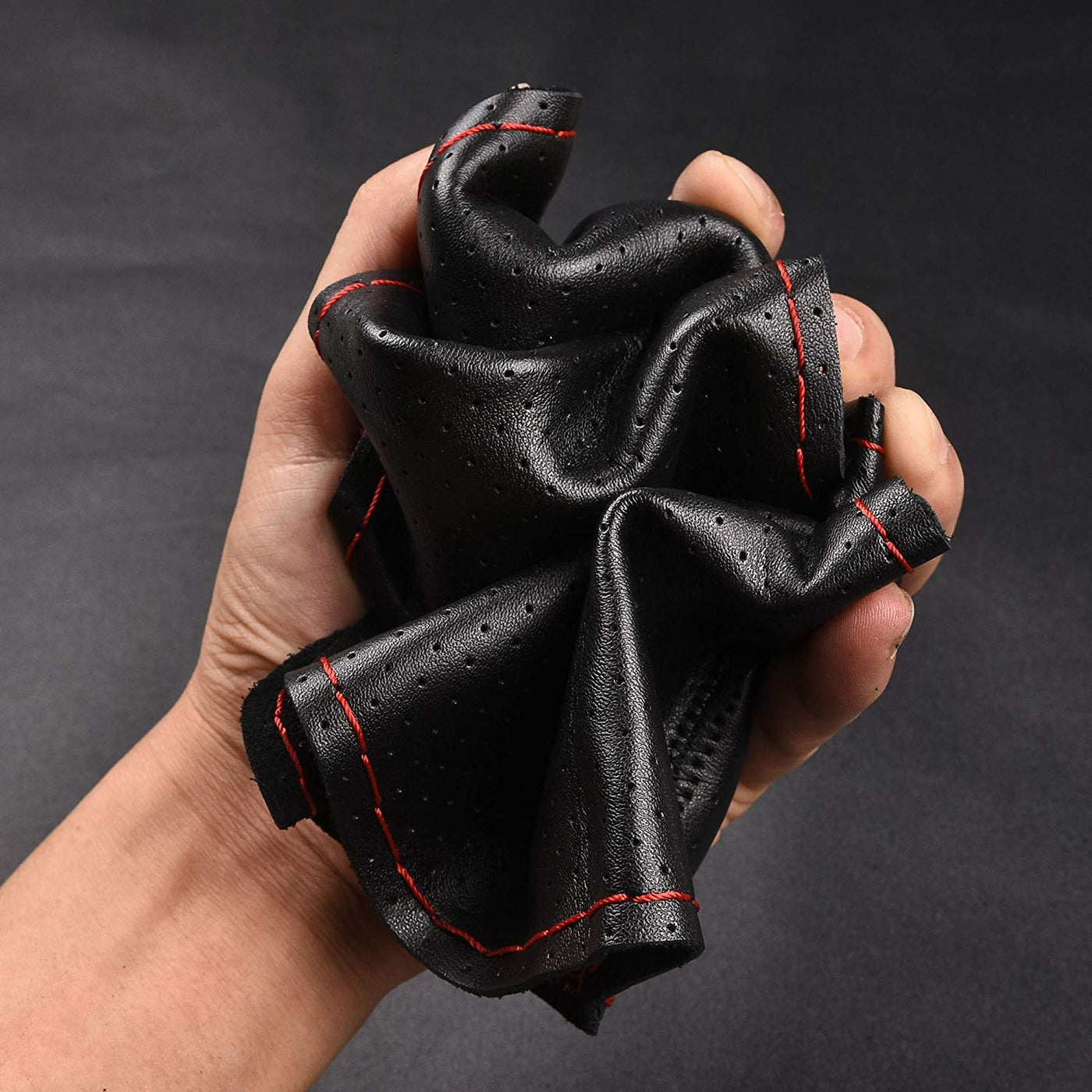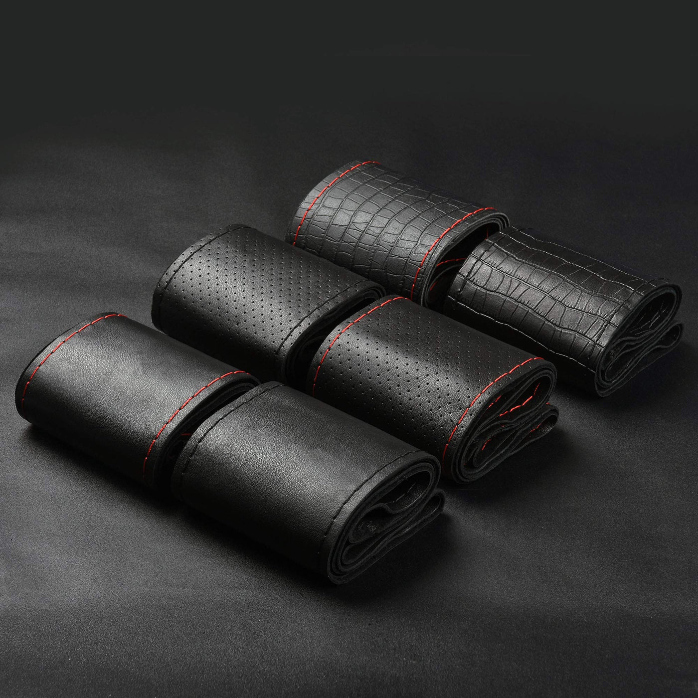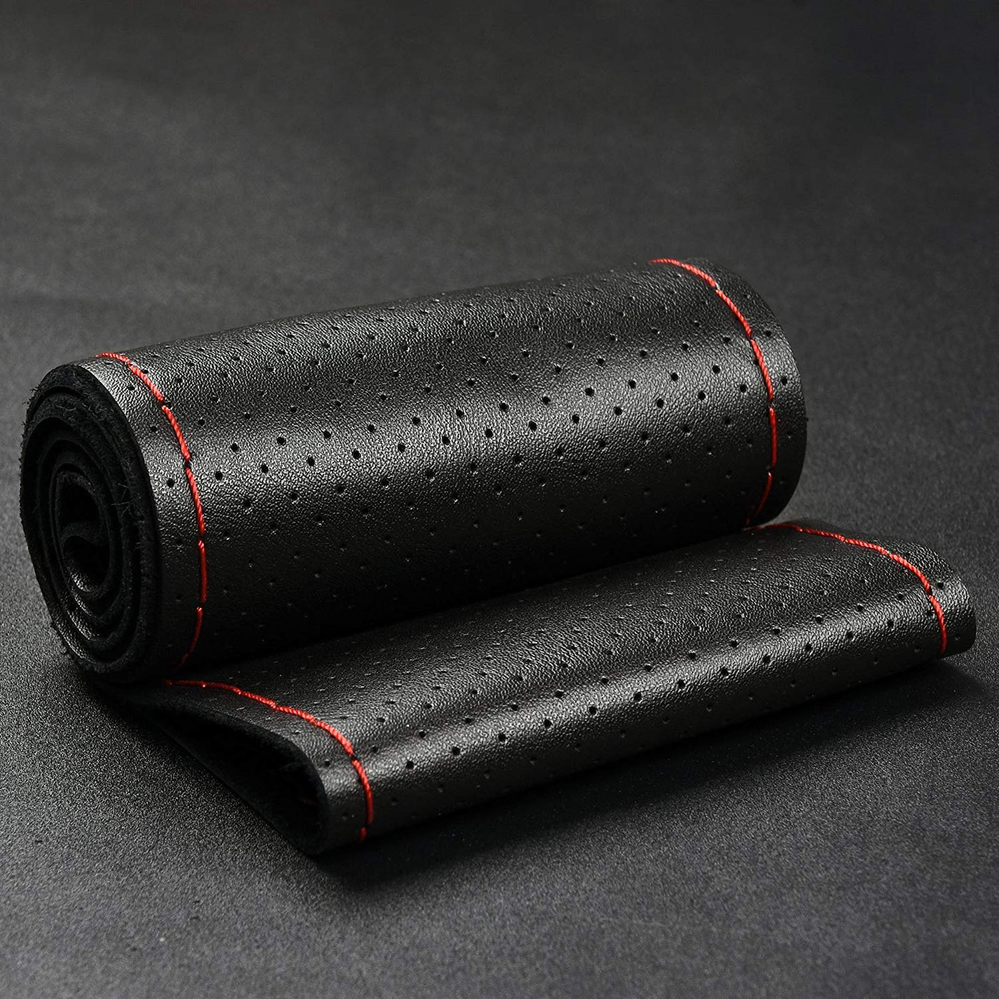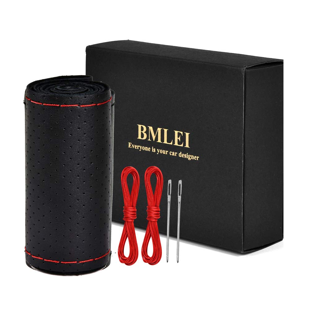 BMLEI Universal Car Steering Wheel Cover with Top Genuine Leather, Anti-Slip Design and Soft Padding, Stitching Style (Black Leather with red Thread)