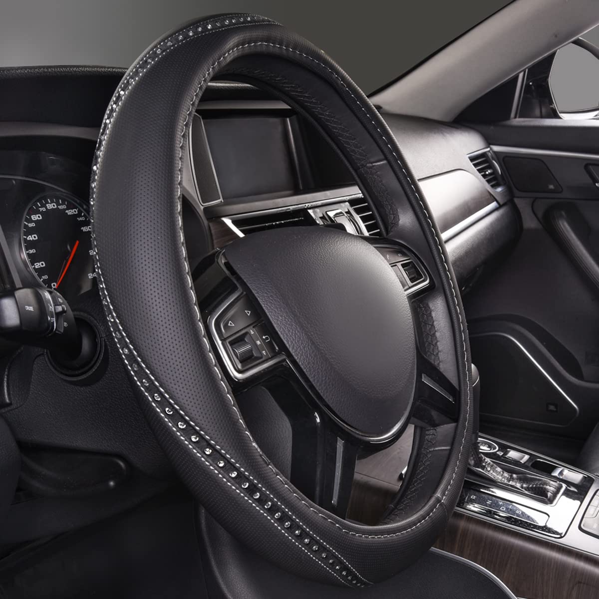 Q: What materials are used in the construction of this steering wheel cover?A: The steering wheel cover is made from high-quality PU leather and features hundreds of shiny rhinestones fixed by a silver metal frame, providing a luxurious look and comfortable grip.