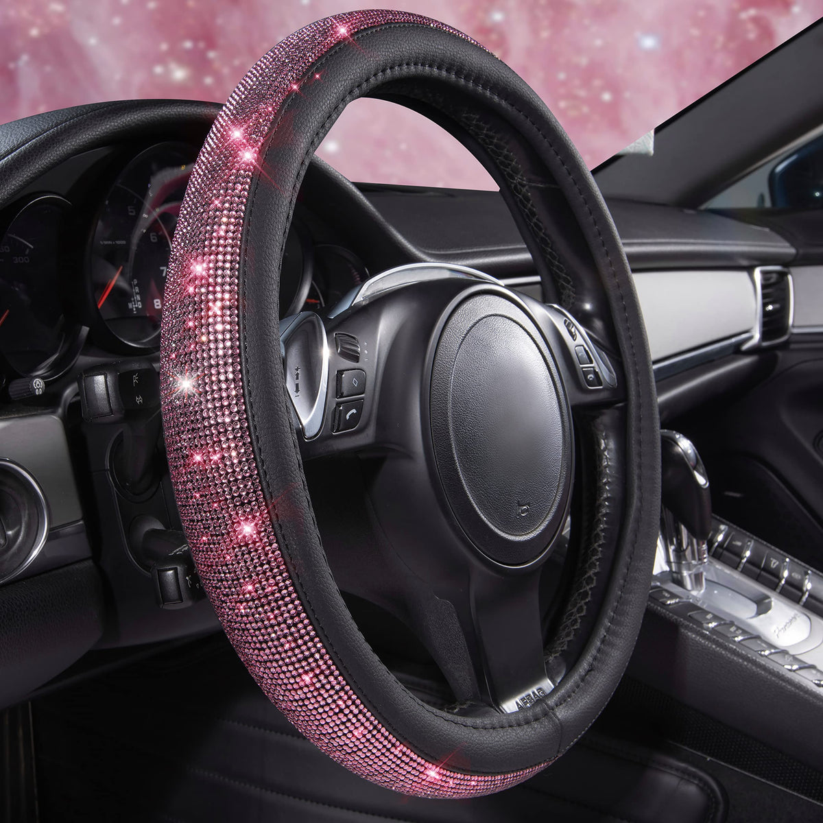 Car Pass Bling Diamond Leather Steering Wheel Cover, Bling Sparkly Crystal Glitter Rhinestones Universal Fit 14'' 1/2-15'' Car W