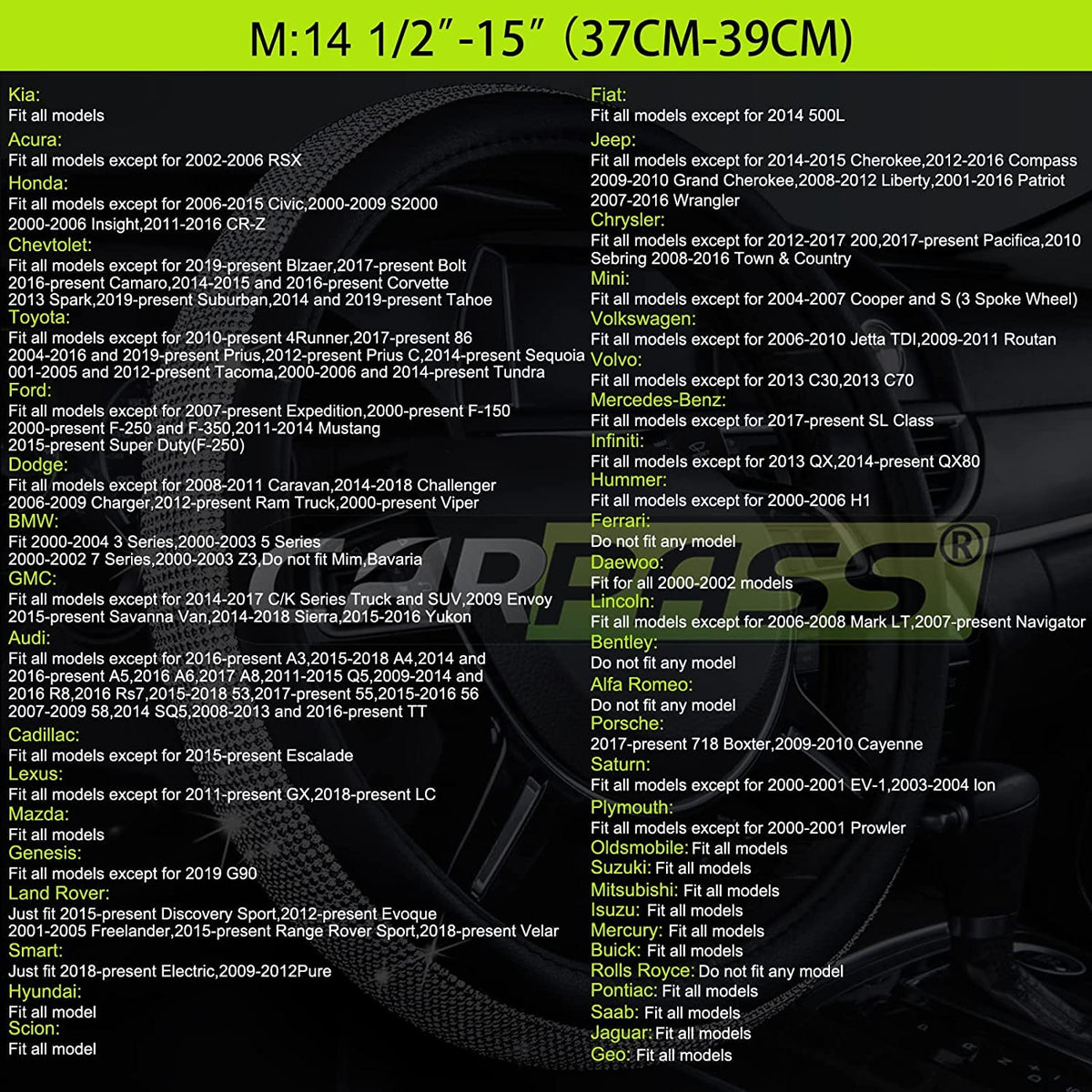 Q: What sizes do the Car Pass Pink Embroidery Butterfly Steering Wheel Covers fit?A: The Car Pass Pink Embroidery Butterfly Steering Wheel Cover is designed to fit standard steering wheels ranging from 14.5 inches to 15.5 inches in diameter, making it a versatile choice for various vehicles including SUVs, small trucks, sedans, and cars.