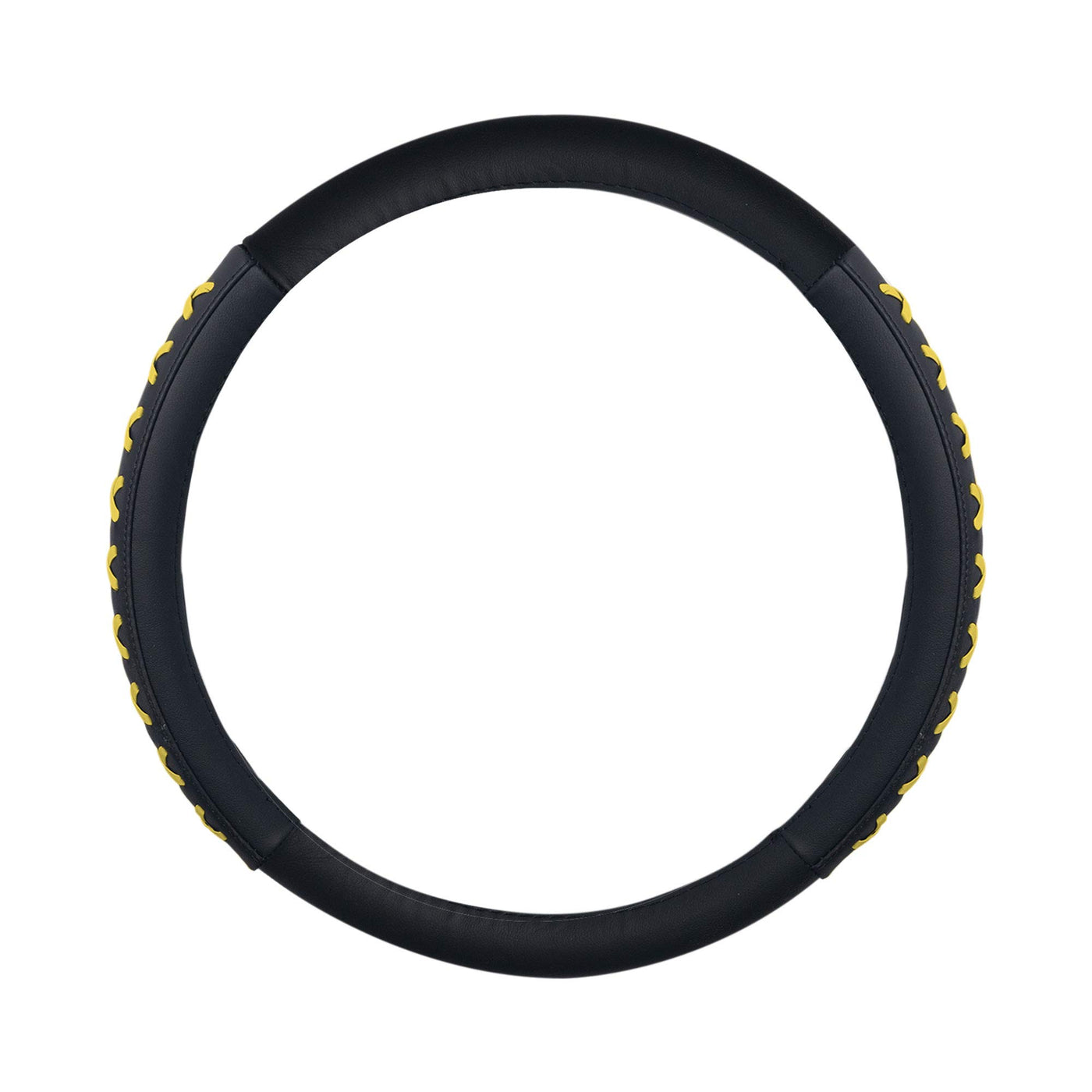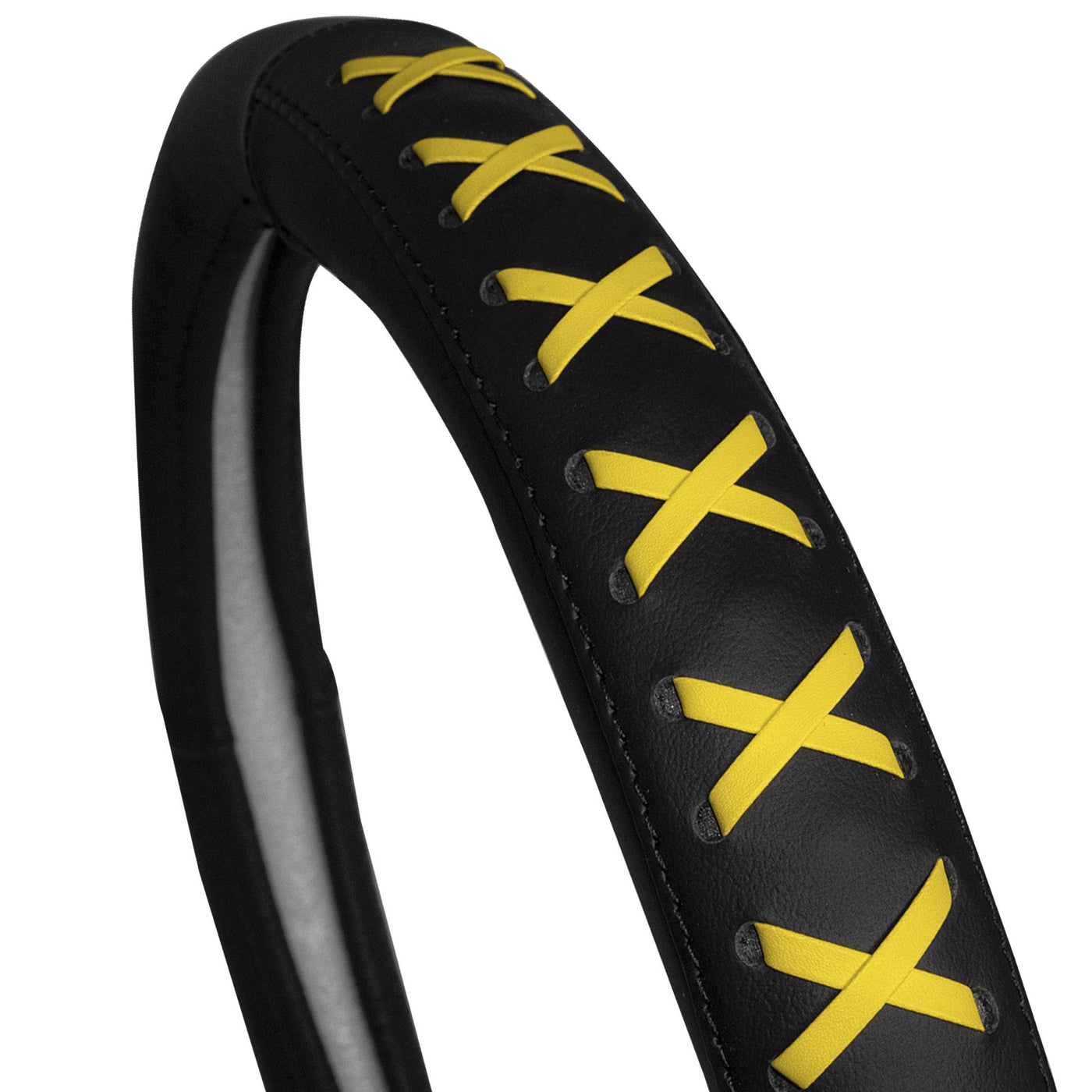 Fh Group Universal Fit 15 Inch Genuine Leather With Lace-Up Detailing Steering Wheel Cover Fits Most Cars, Suvs Yellow