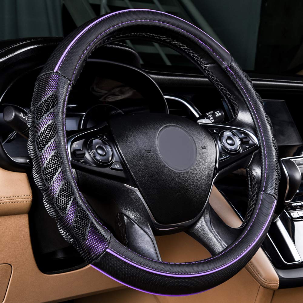 Flying Banner Car Steering Wheel Cover Faux Leather Massage Universal Fit 3D Honeycomb Hole Anti-Slip Sporty 15 Inches (Purple Black)
