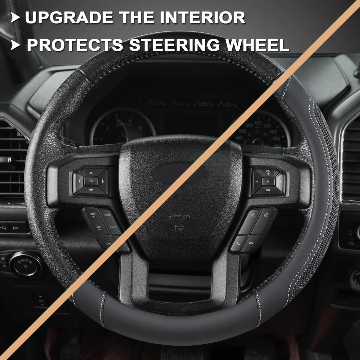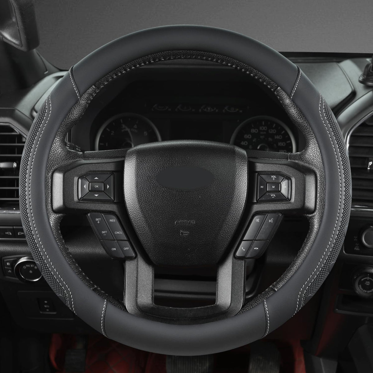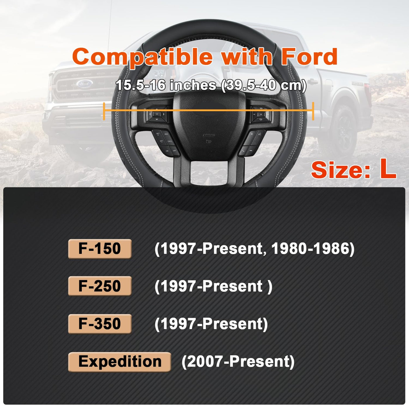 ???CUSTOM FIT?This GIANT PANDA steering wheel cover fits Ford F-150, F-250, F-350, Expedition 15.5-16 inch (39.5 cm to 40 cm) large steering wheel perfectly. Please check the model year of the compatibility list. | ???PREMIUM MATERIAL? This steering wheel cover is made of microfiber diamond pattern leather. It can greatly reduce the hand sweat to increase comfort. It is wear-resistant and durable. | ???SAFE ANTI-SKID DESIGN? The diamond pattern on the side and the anti-slip inner ring will greatly improve the grip and improve the control of the steering wheel for a safer driving. | ???DECORATION AND PROTECTION? This elegant steering wheel cover not only protects your steering wheel well, but also perfectly decorate your car interior. It will blend in well with your car interior. | ???EASY INSTALLATION? You can complete the installation in minutes after reading the installation guide in the package. Please use a hair dryer to heat it before installation. Heating will make installation easier and help smooth the crease.