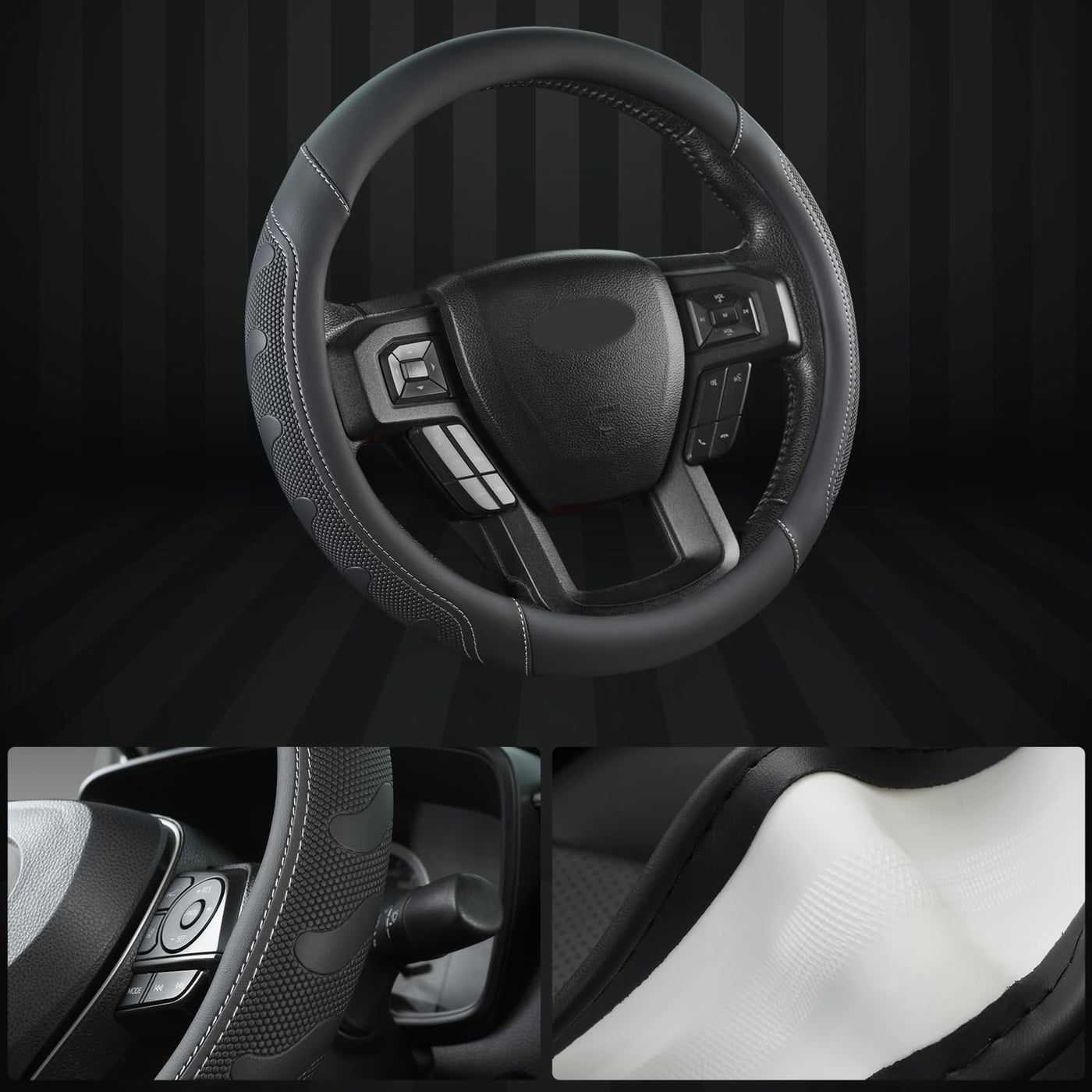 Q: Does the steering wheel cover provide a better grip?A: Yes, the anti-skid design featuring a diamond pattern on the side and an anti-slip inner ring significantly improves grip and control of the steering wheel, enhancing safety while driving.