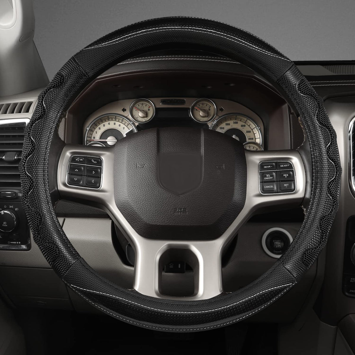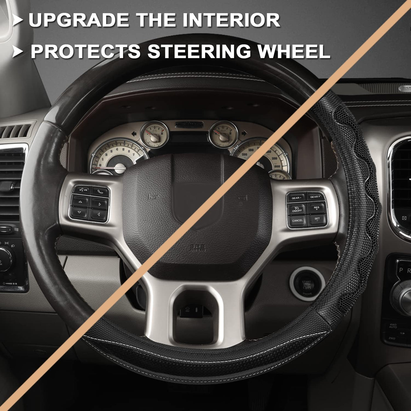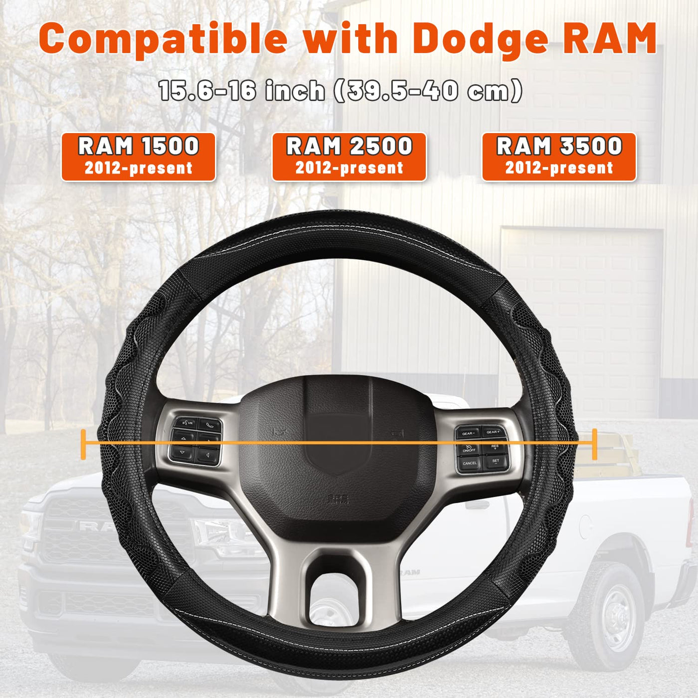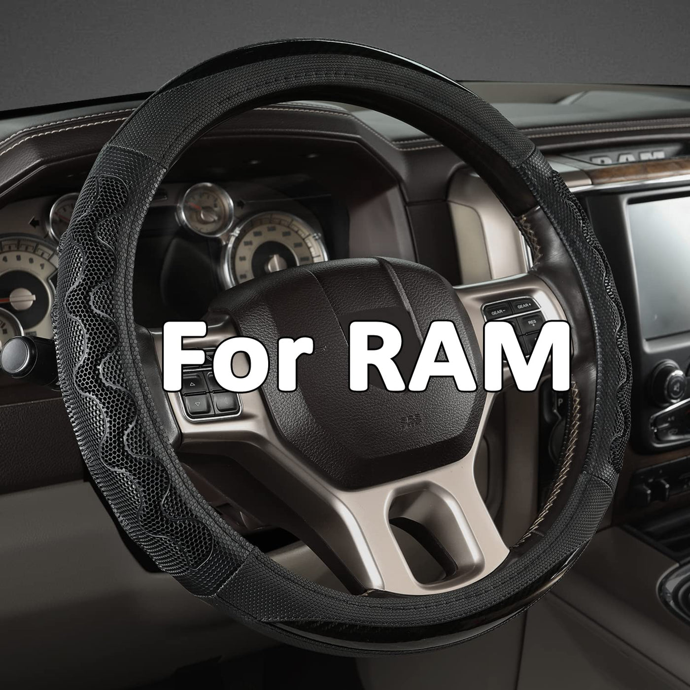 SPECIFICATION: - Style: 3D honeycomb car steering wheel cover - Compatible with Dodge RAM 2019-2022 - Weight: 520 g/1.1 lbs - Surface Material: PVC leather - Inner Material: rubber layer