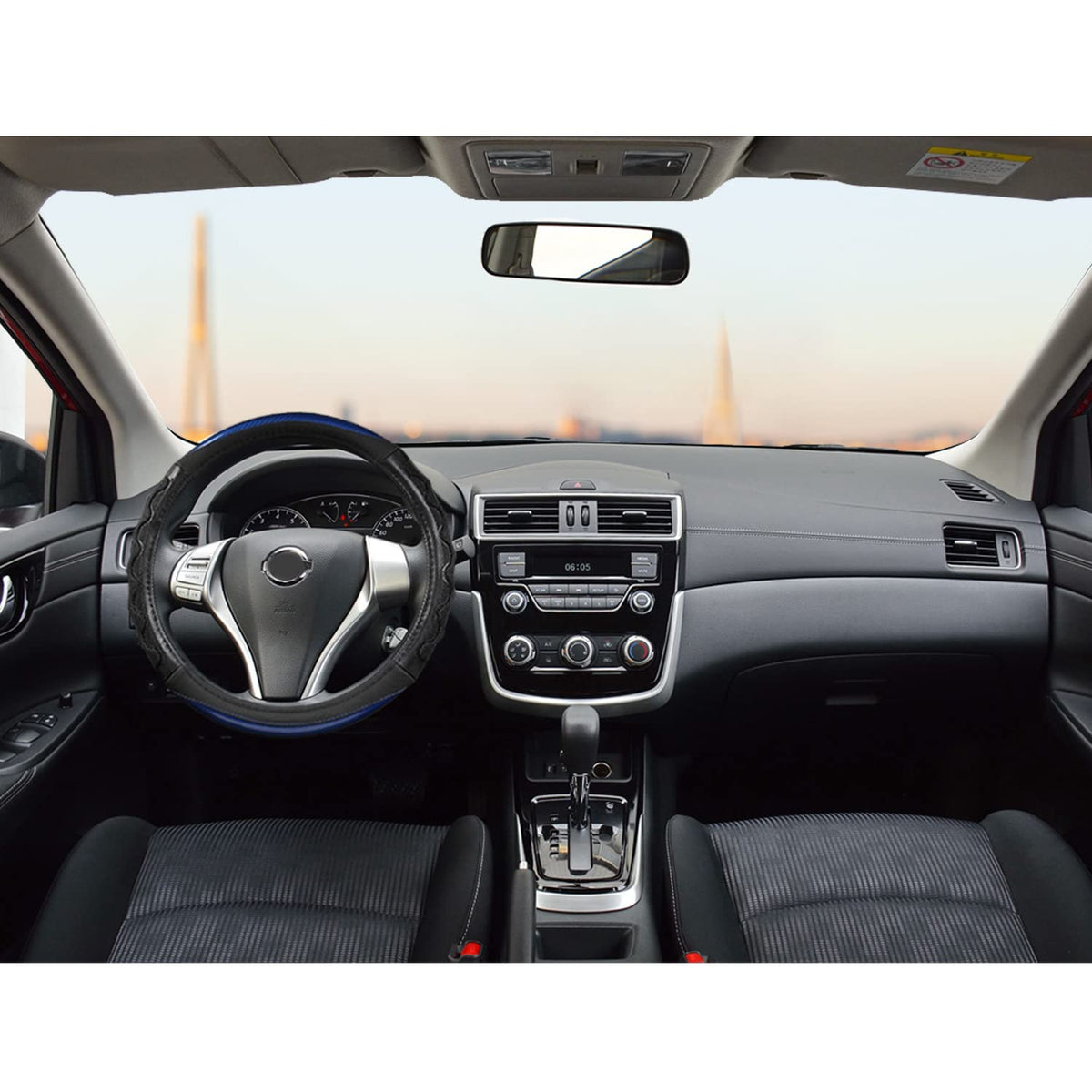 Experience a comfortable and secure grip with the GIANT PANDA Steering Wheel Cover, designed to fit Nissan Rogue, Altima, and Sentra models with 14.5-15-inch (37-38 cm) standard steering wheels. Crafted from durable, wear-resistant PVC leather, this cover features a 3D honeycomb pattern and an anti-slip inner ring for improved grip and safer driving. The breathable honeycomb design helps reduce hand sweat, ensuring a more comfortable driving experience. Protect and enhance your car's interior with this cool blue, round-shaped steering wheel cover, which is easy to install with the provided guide and a hairdryer for added convenience. Measuring 15 inches in diameter, this STEERING WHEEL COVER is a perfect blend of functionality, style, and protection for your vehicle.