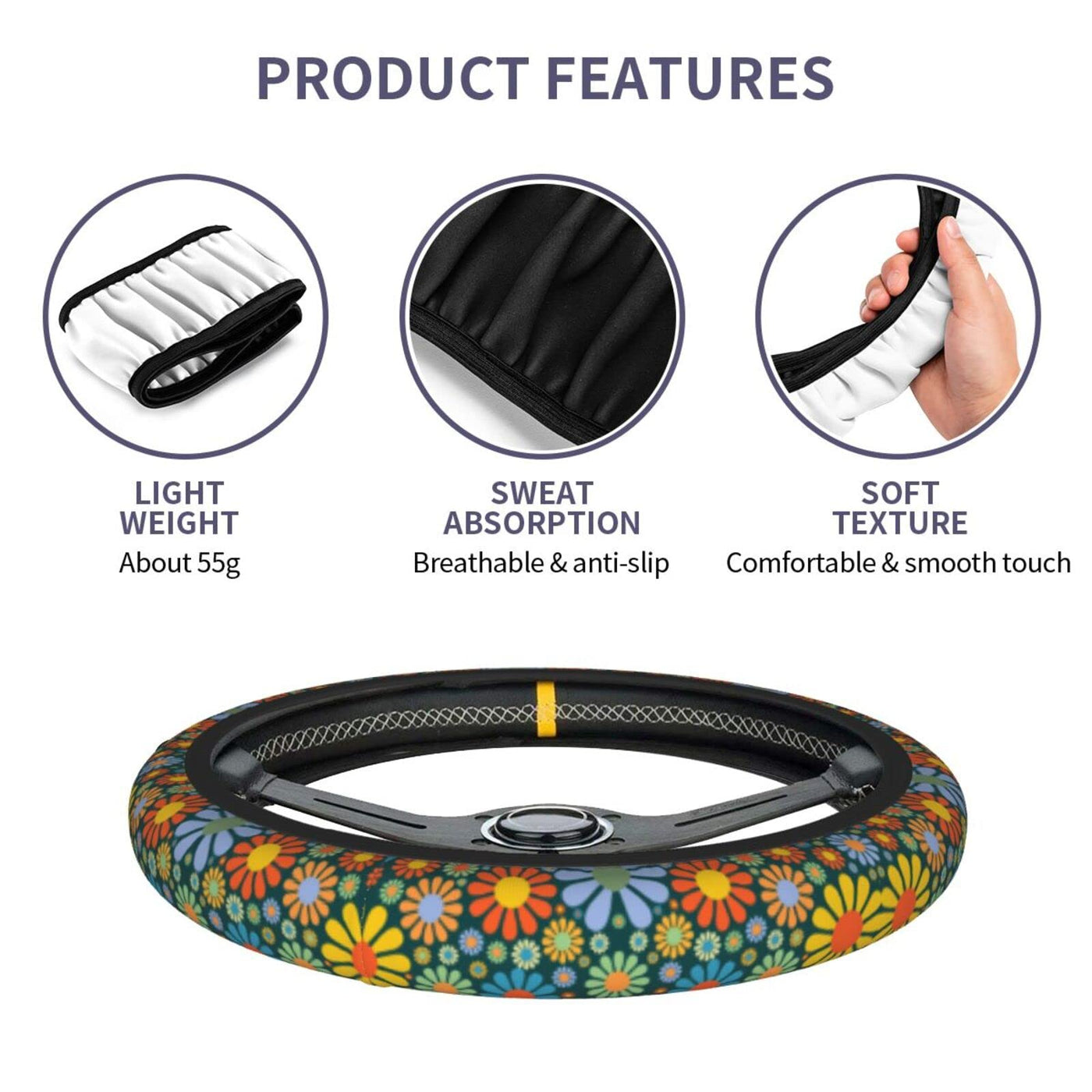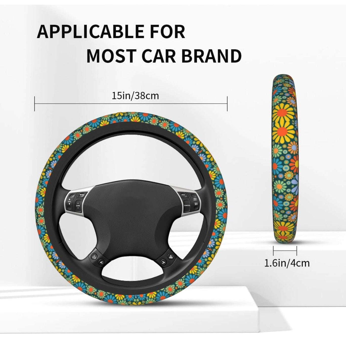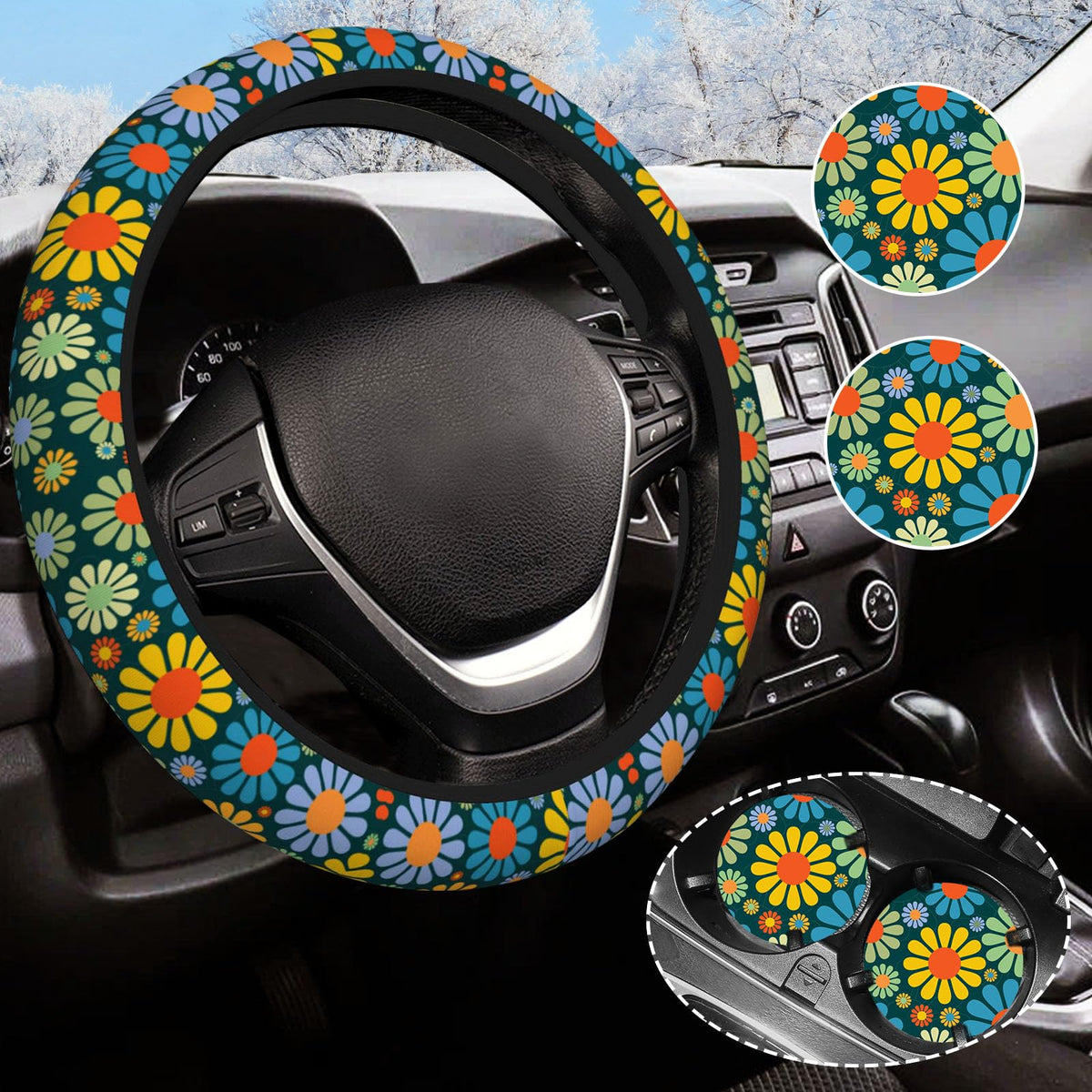 Hippie Daisy Flower Steering Wheel Cover for Women Men with 2 Pcs Car Coasters, Universal 14.5-15 Inch Rainbow Steering Wheel Co