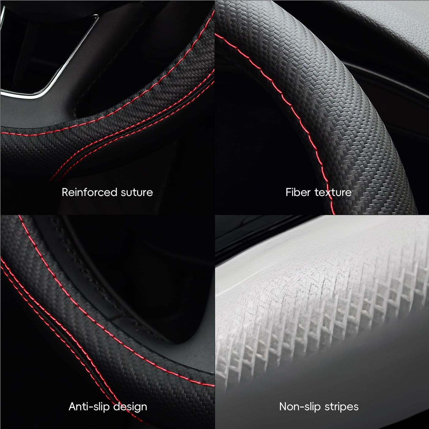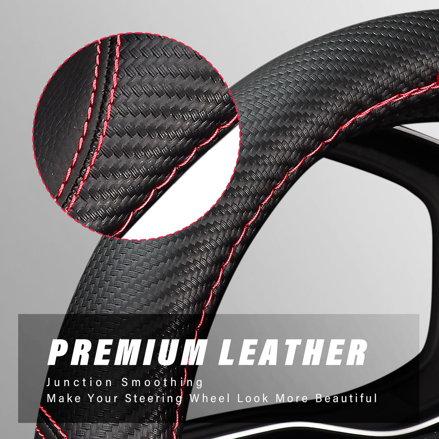 Q: What materials is the steering wheel cover made from?A: The steering wheel cover is made from high-quality microfiber leather, which is skidproof, stable, and heat resistant, ensuring durability and comfort while driving.