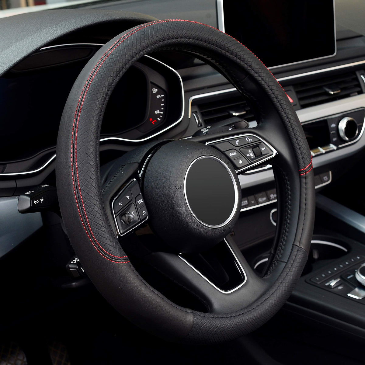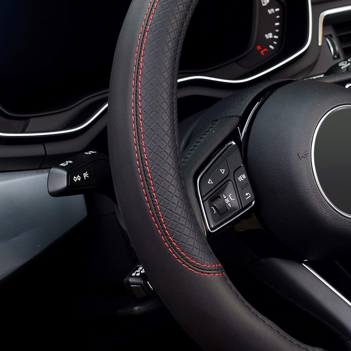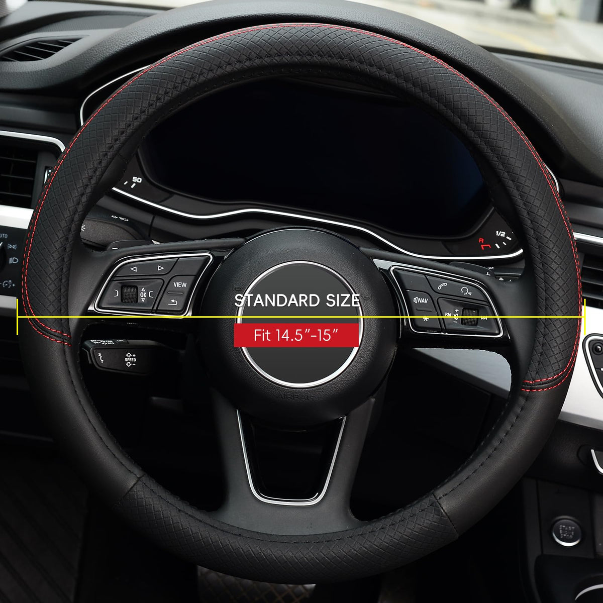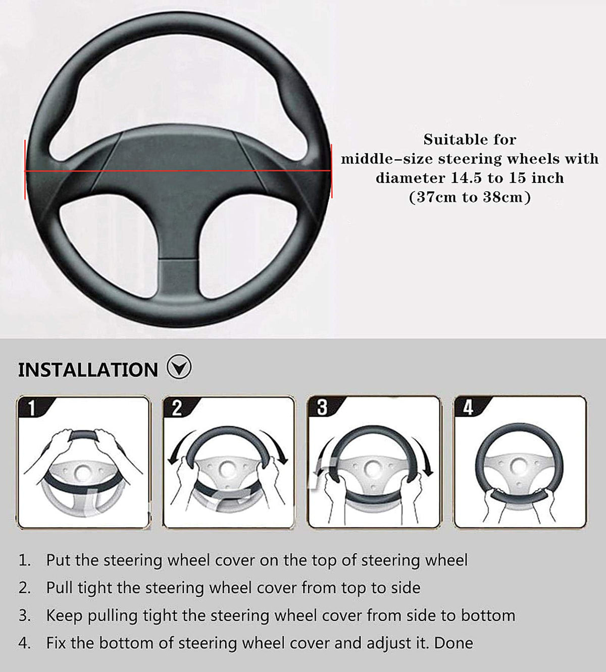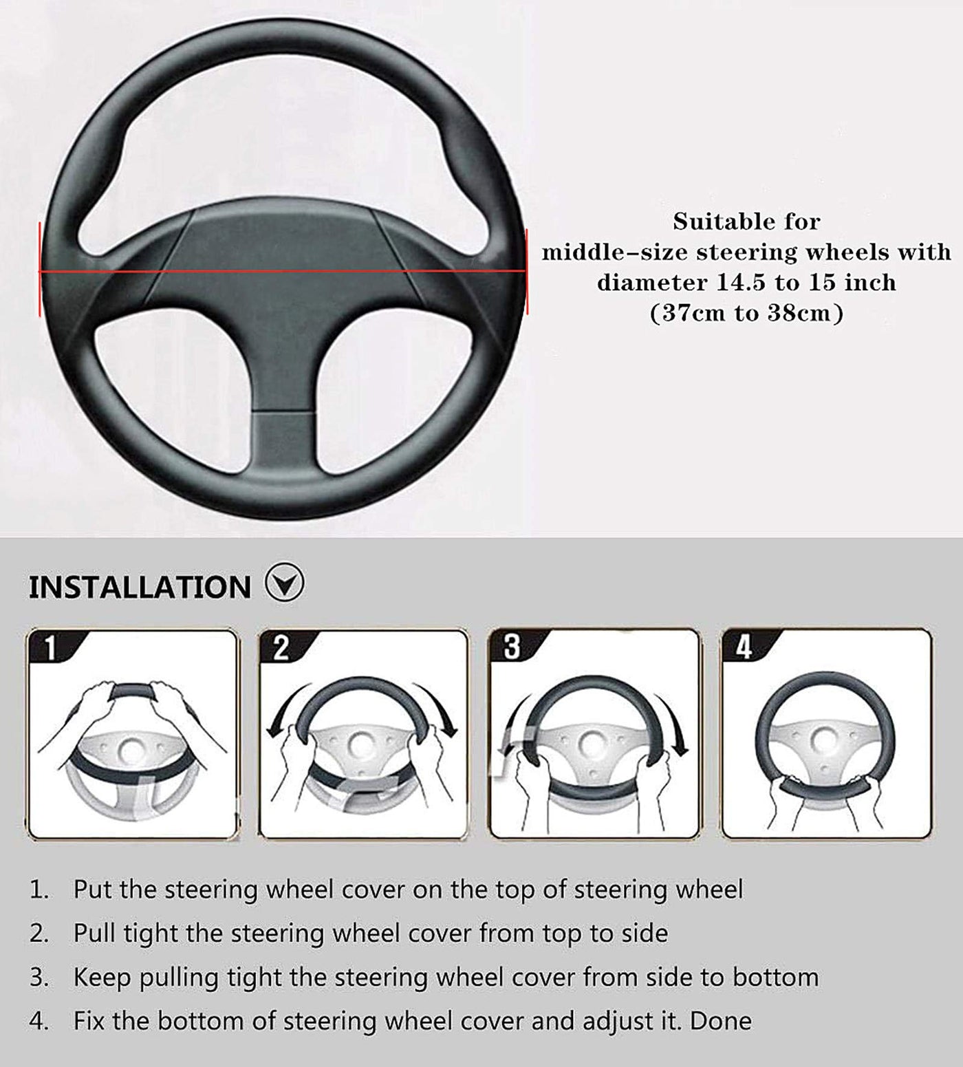 It fits for steering wheels with outside diameter of 14 1/2 to 15 inch.Skidproof, heat resistant.Flexible and scalable. Microfiber Leather design for better keep warm and added comfort.It can not only decorate your car steering wheel, protect from stains and scratches but also hide existing wear and keep your steering wheel looking new. This premium product is an excellent choice for anyone close to you on example their birthday, Christmas or any other suitable occasion.