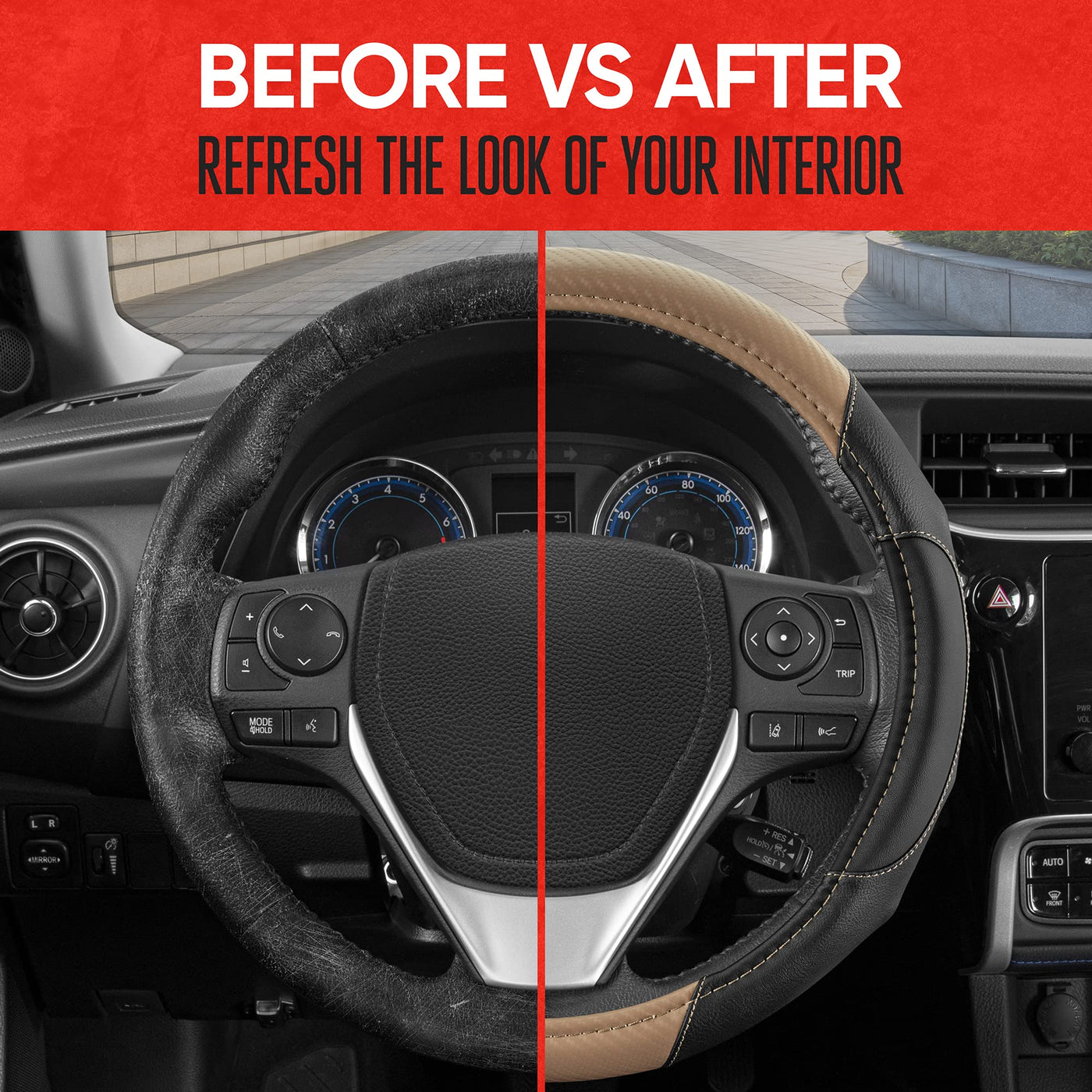 Q: Is the steering wheel cover easy to install?A: Yes, the Motor Trend GripDrive Steering Wheel Cover is easy to install. It fits snugly and seamlessly onto your steering wheel, ensuring it stays securely in place during driving.