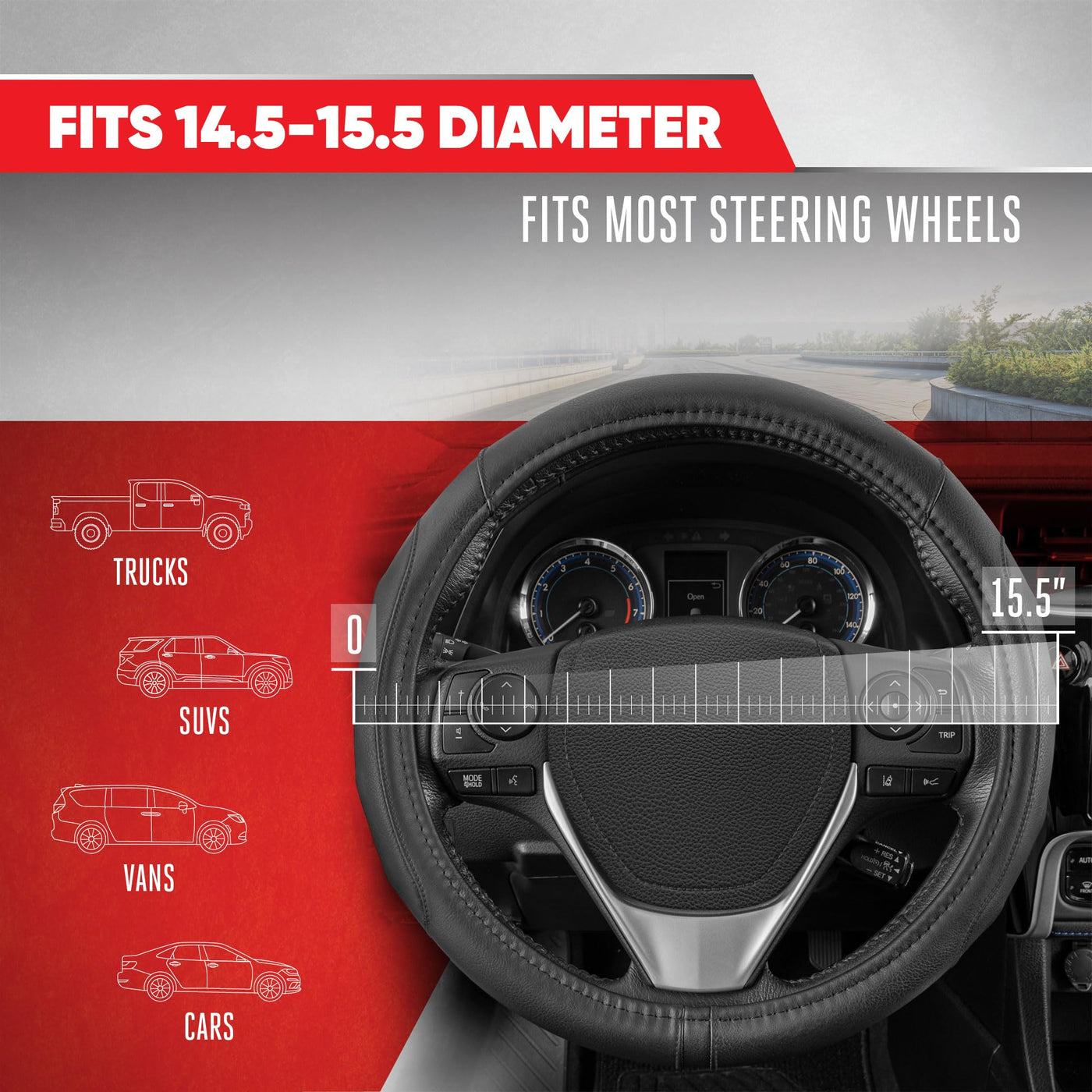 The GripDrive Pro Steering Wheel Cover by Motor Trend is the Perfect Addition to Any Vehicle:Features Sporty Accent Stitching and Double Stitched Seams for Extra Strength and DurabilitySoft, Sporty, Leather Grip Makes for a Clean, Sleek, Look with Excellent Traction and ControlInsulated Design Keeps your Hands Warm in the Winter and Cool in the SummerDesigned and Licensed in the USA (Los Angeles)