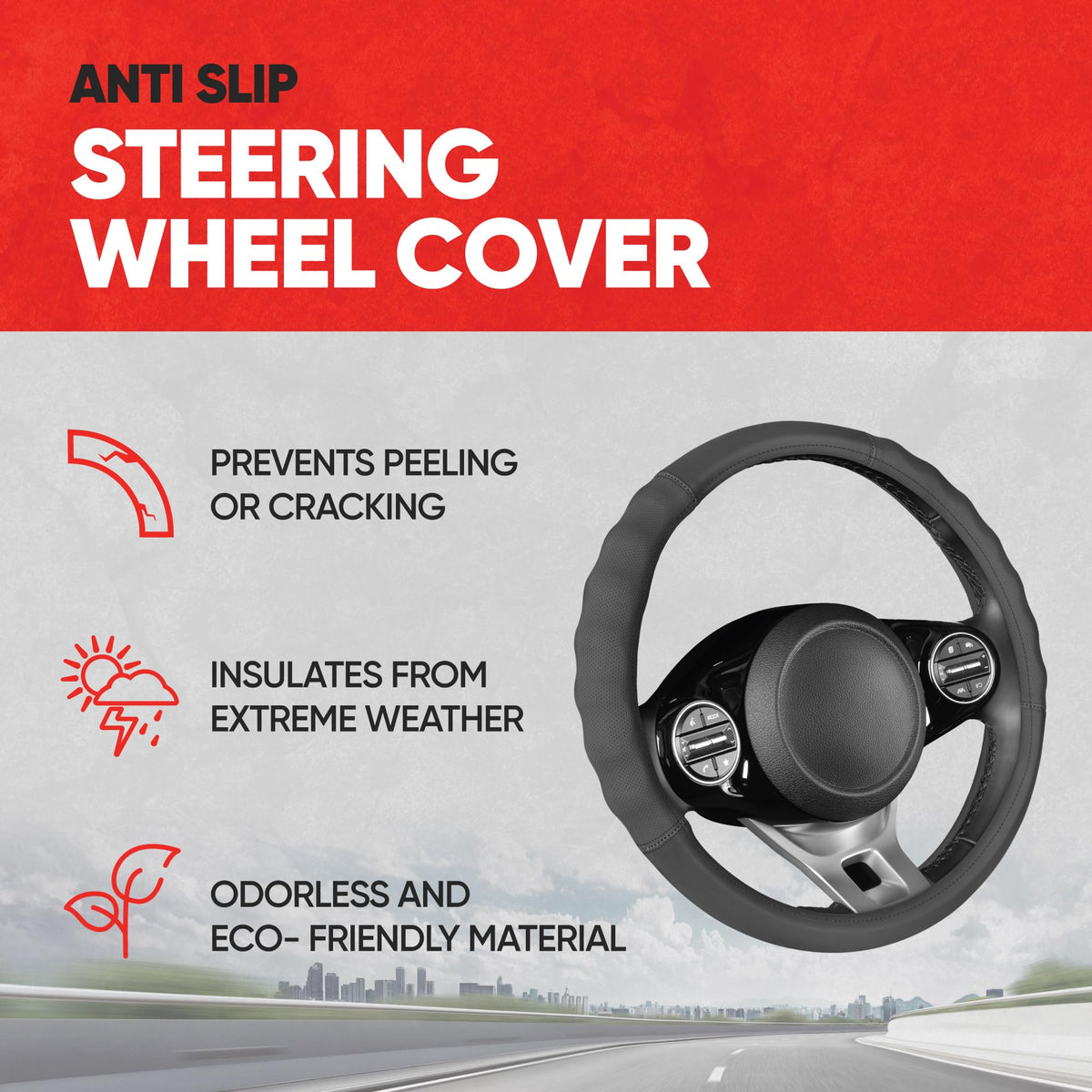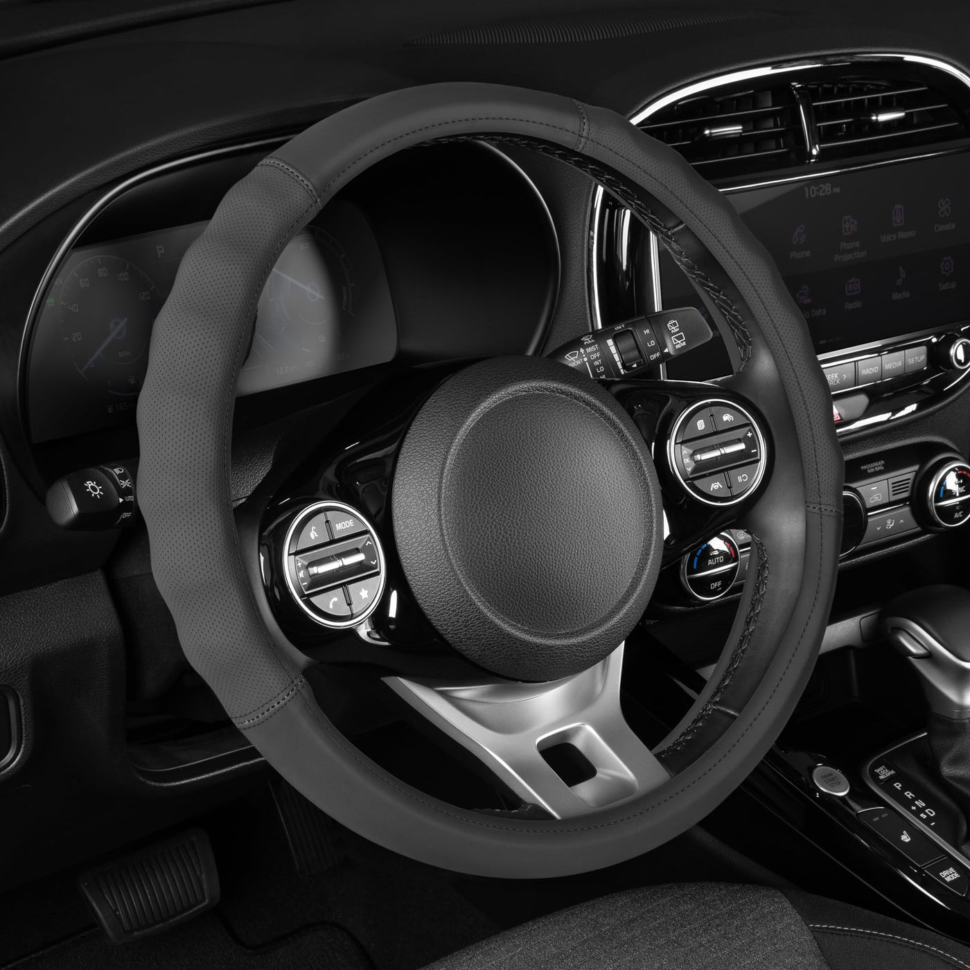 Motor Trend Soft Touch Leather Gray Steering Wheel Cover with Grooves, Advanced Traction Universal Fit for Standard Sizes 14.5 1