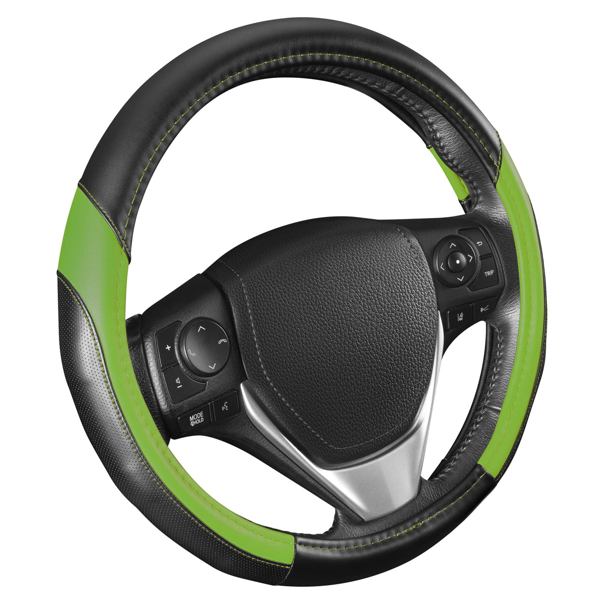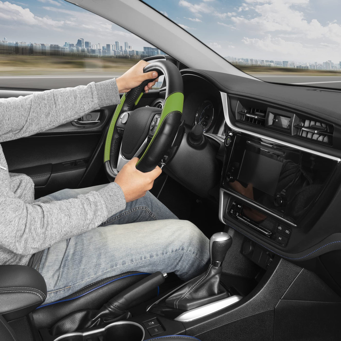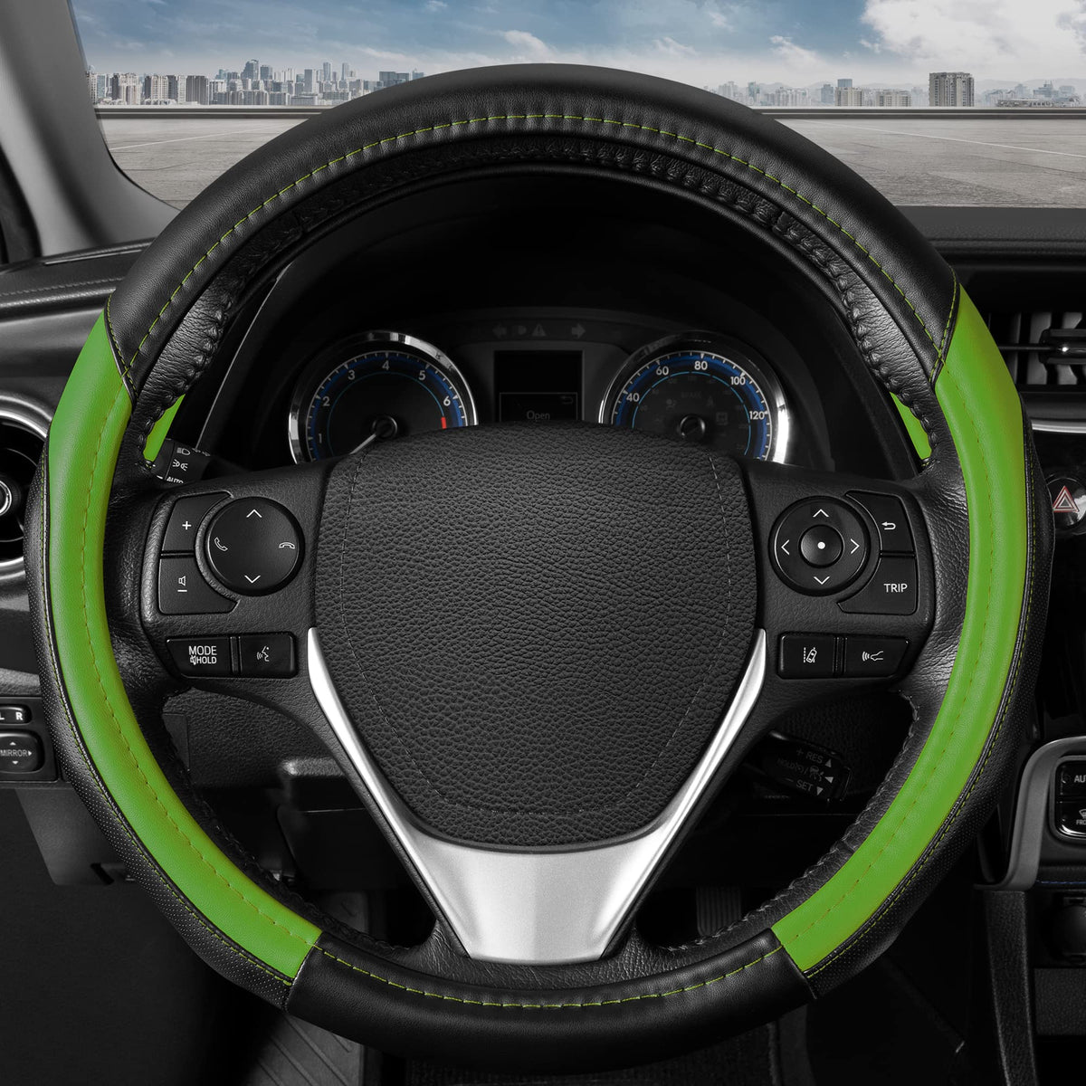 Motor Trend Sportdrive Faux Leather Steering Wheel Cover, Standard 15 Inch Size, Two-Tone Black & Green, Car Steering Wheel Cove