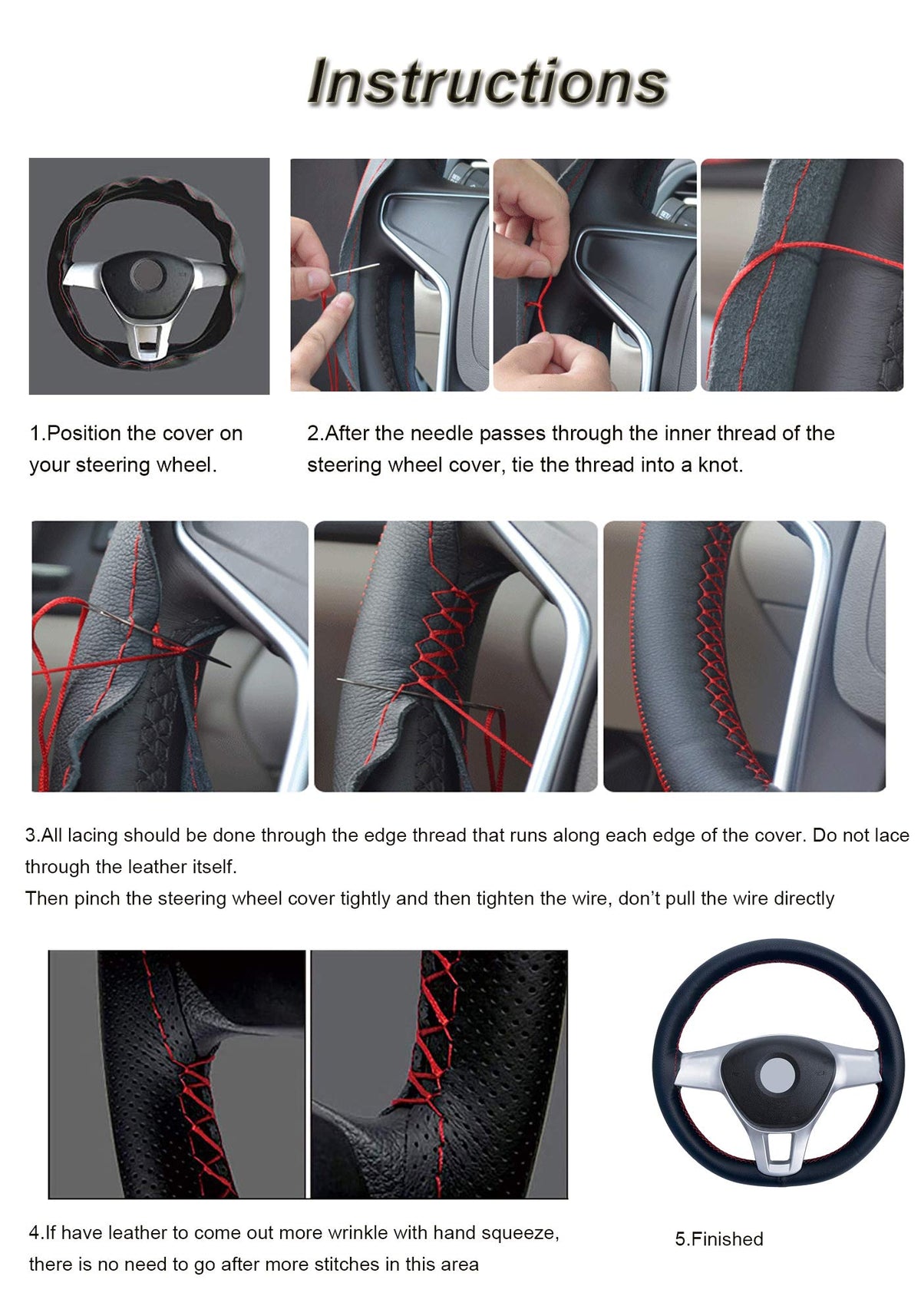 Q: How do I install the steering wheel cover?A: Installation is straightforward. Simply stretch the cover over your steering wheel, using the provided needles and threads to sew it in place. It's recommended to run the cover under hot water or microwave it for one minute to make it more flexible for easier installation.