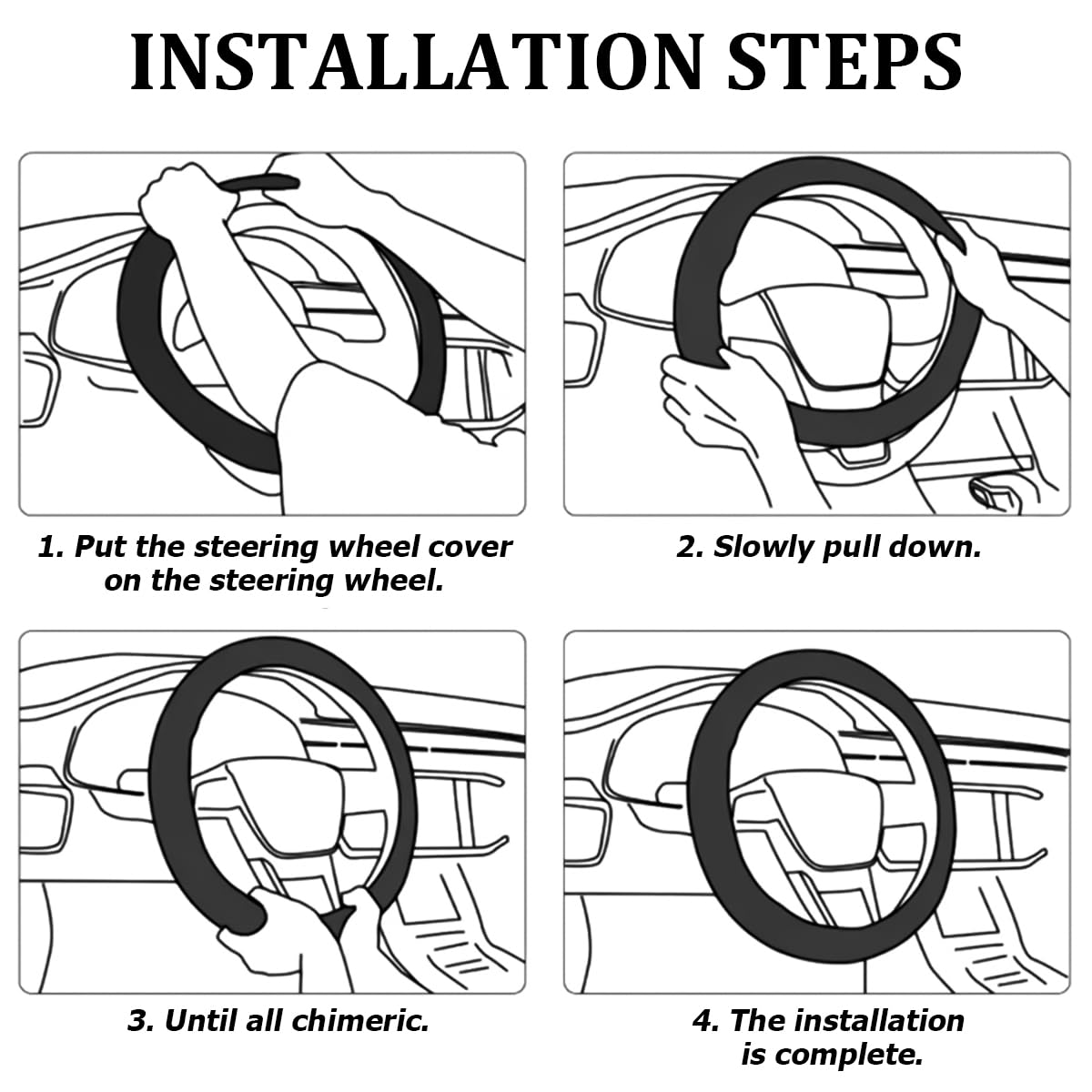 Q: How do I install the steering wheel cover?A: Installation is simple and tool-free. Just place the steering wheel cover onto the steering wheel, press down from the top, and pull it down slowly to cover the bottom edge.