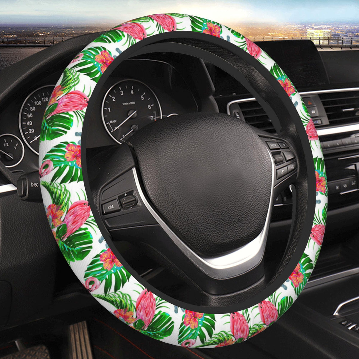 Pink Flamingo Tropical Palm Flower Leaves Steering Wheel Covers Non Slip Neoprene Steering Wheel Protector Cover Universal 15 In