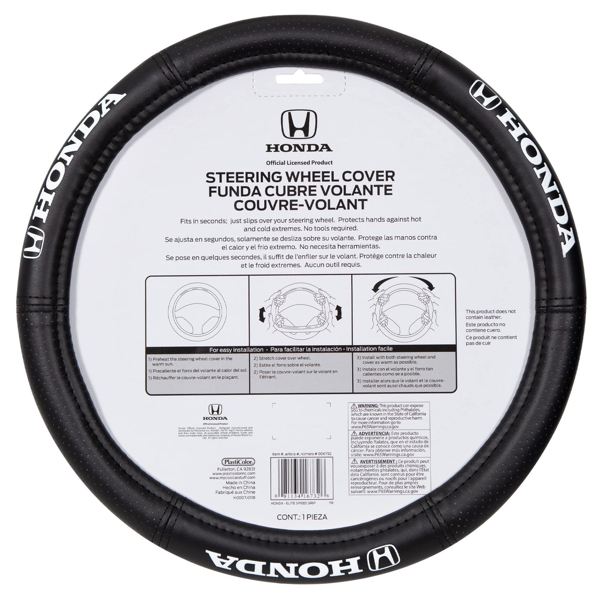 Plasticolor’s Honda Elite Series premium steering wheel cover is built with quality and style. This Listing is for one (1) Steering Wheel Cover. It was designed to fit MOST vehicles; therefore, it will NOT fit steering wheels smaller than 14.5 inches and bigger than 15.0 inches. A few Civic model years have a 13.5 inch-14 inch steering wheels that this cover will NOT fit. To ensure your satisfaction, simply measure your steering wheel before purchase. This cover adds comfort and style to any vehicle while protecting the vehicle's original steering wheel. Made with high quality stitching and graphics, it gives a bold and clear style that’s sure to make your steering wheel cover stand out on the road. Plasticolor's Honda Elite Series cover will have your steering wheel looking and feeling fun, sporty, classy, and fashionable everywhere you drive your vehicle. Provides quality grip during cold or hot weather. For easy installation, please preheat the steering wheel cover in the sun until warm. Stretch cover over wheel, making sure the steering wheel and cover are both warm, for better results.