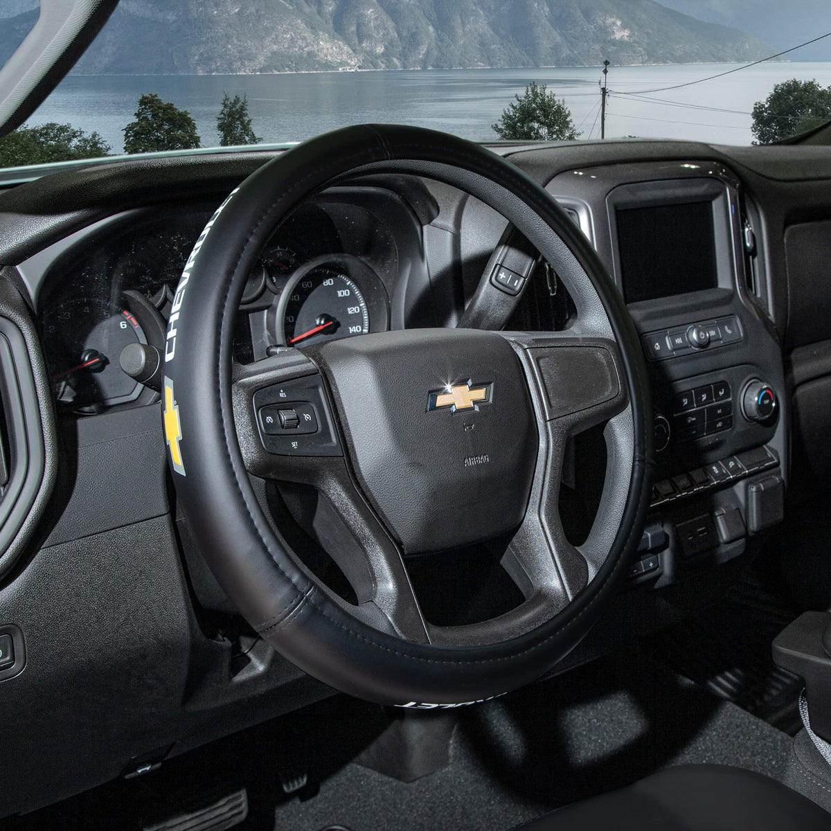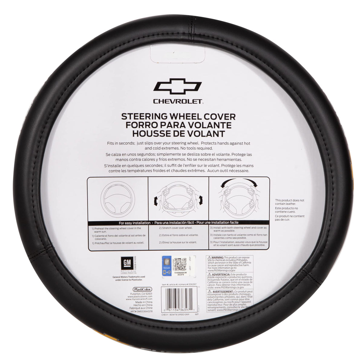 Plasticolor’s Chevrolet Bowtie Speed Grip premium steering wheel cover is built with quality and style. This Listing is for a 1pc Steering wheel Cover. This steering wheel cover was designed to fit MOST vehicles; therefore, it will NOT fit steering wheels smaller than 14.5 inches and bigger than 15.5 inches. Spped Grip design adds comfort and style to any vehicle while protecting the vehicle's original steering wheel. Made with high quality stitching and graphics, it gives a bold and clear style that’s sure to make your steering wheel cover stand out on the road. Plasticolor's Chevrolet Bowtie Speed Grip cover will have your steering wheel looking and feeling fun, sporty, classy, and fashionable everywhere you drive your vehicle. Provides quality grip during cold or hot weather. For easy installation, please preheat the steering wheel cover in the sun until warm. Stretch cover over wheel, making sure the steering wheel and cover are both warm, for better results.