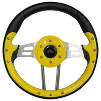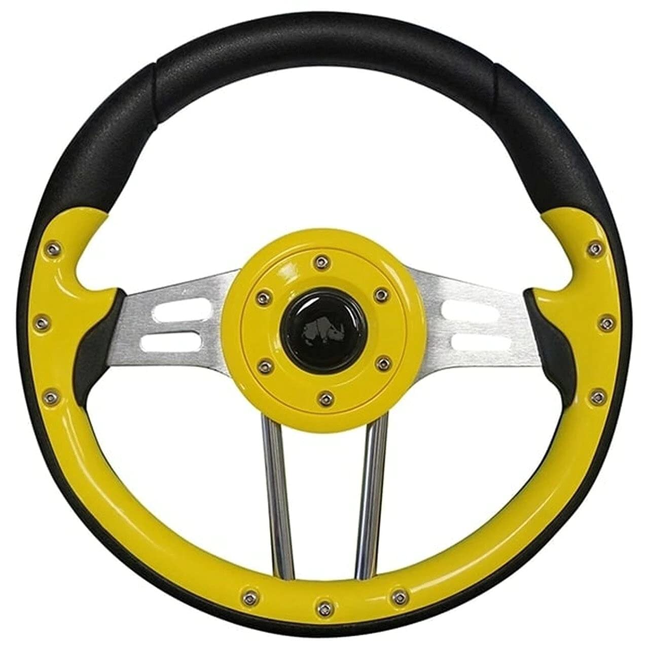 RHOX 13' Diameter Custom Steering Wheel. Style: Aviator 4. Color: Yellow Grip with Brushed Aluminum Spokes. Easy installation on E-Z-Go, Club Car and Yamaha with Custom Adapter (sold separately). Horn button is for aesthetic purposes only. Add a Chrome Adapter (Optional - $25)