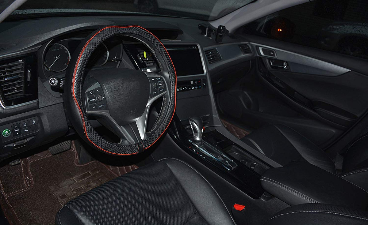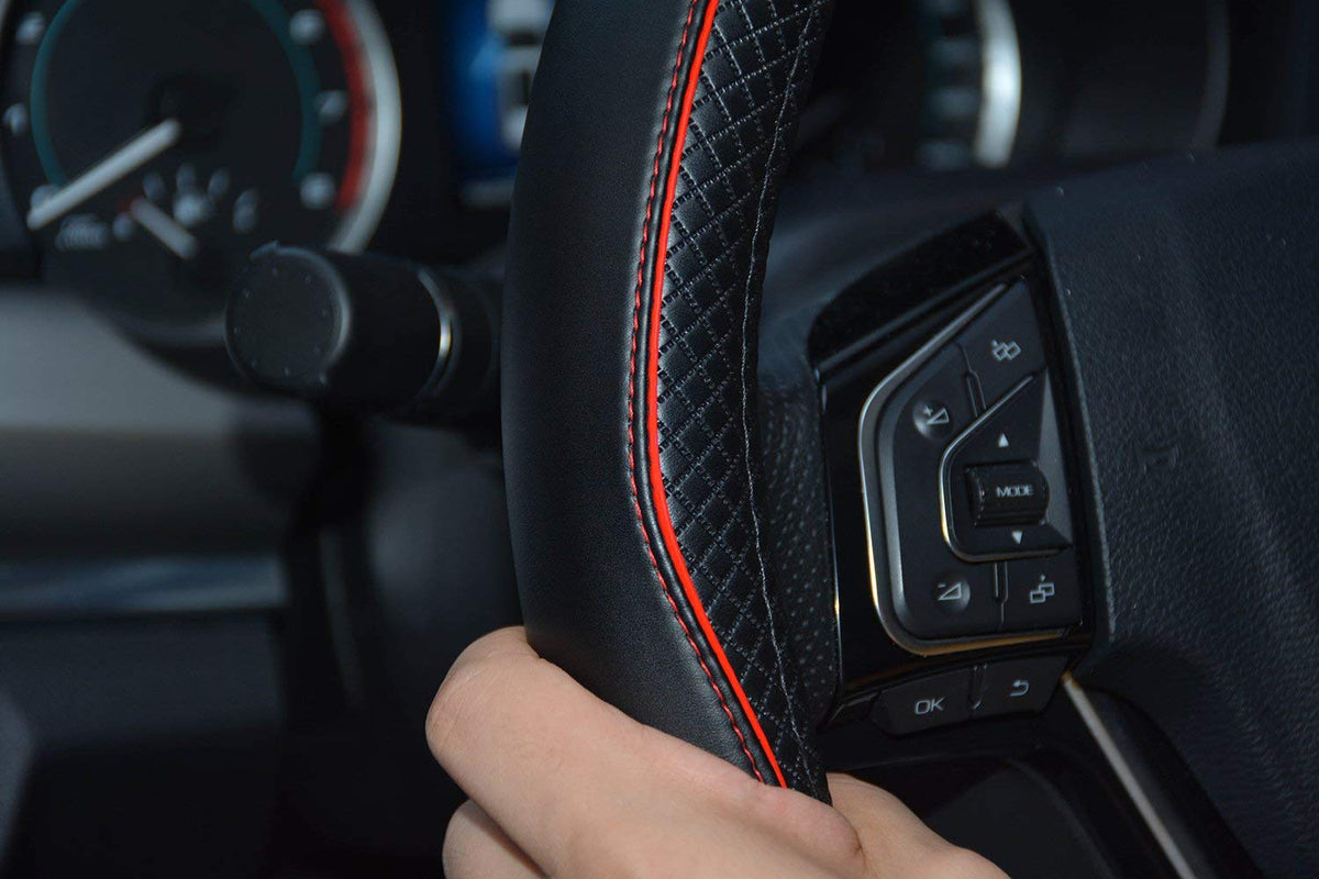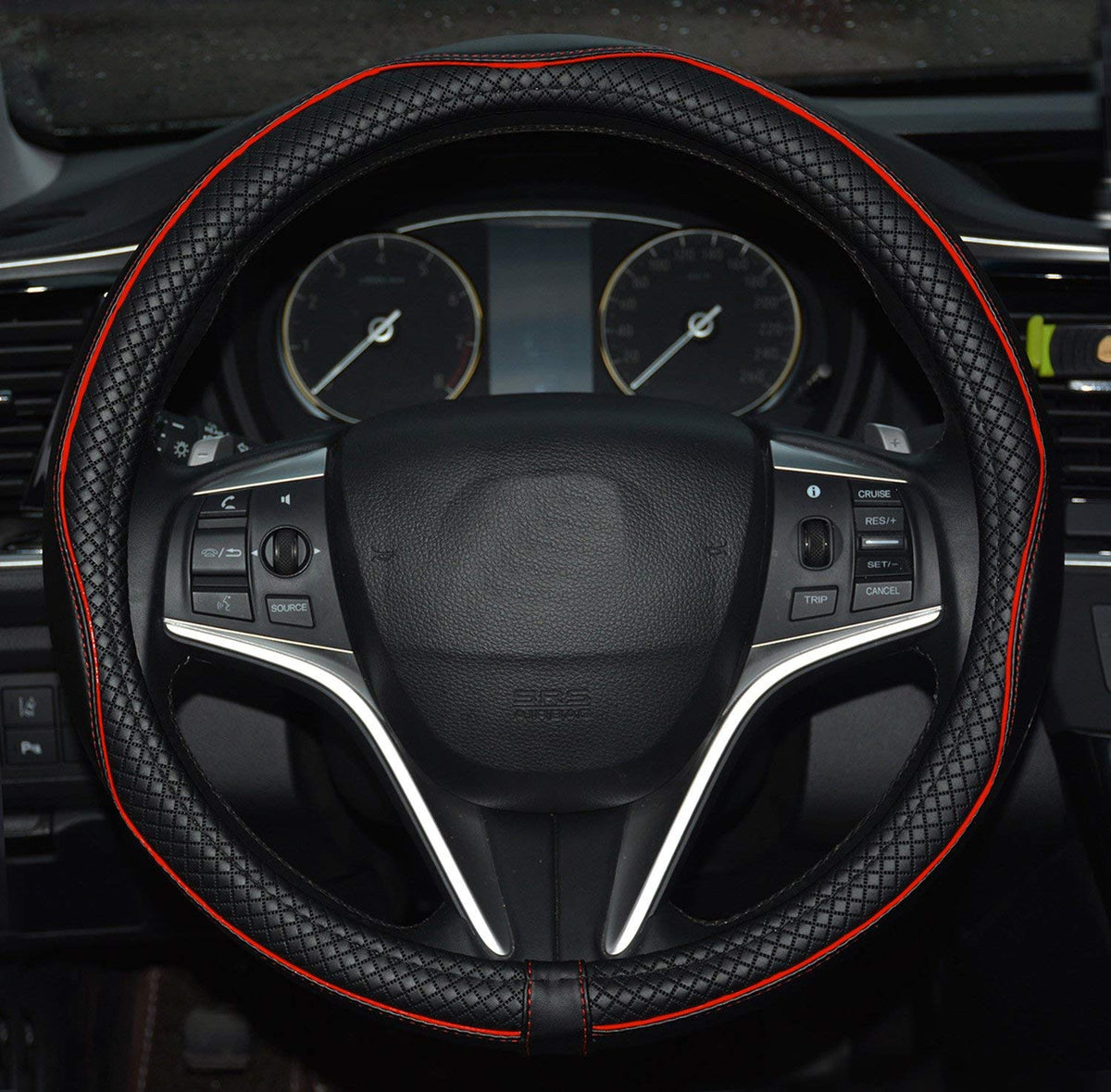 Rueesh Microfiber Leather Car Steering Wheel Cover, Soft Padding, Durable, No Smell, Universal 15 Inch Steering Cover, Anti-Slip Embossing Pattern A, Black with Red Line