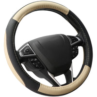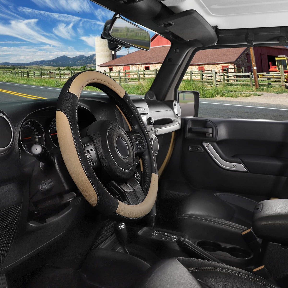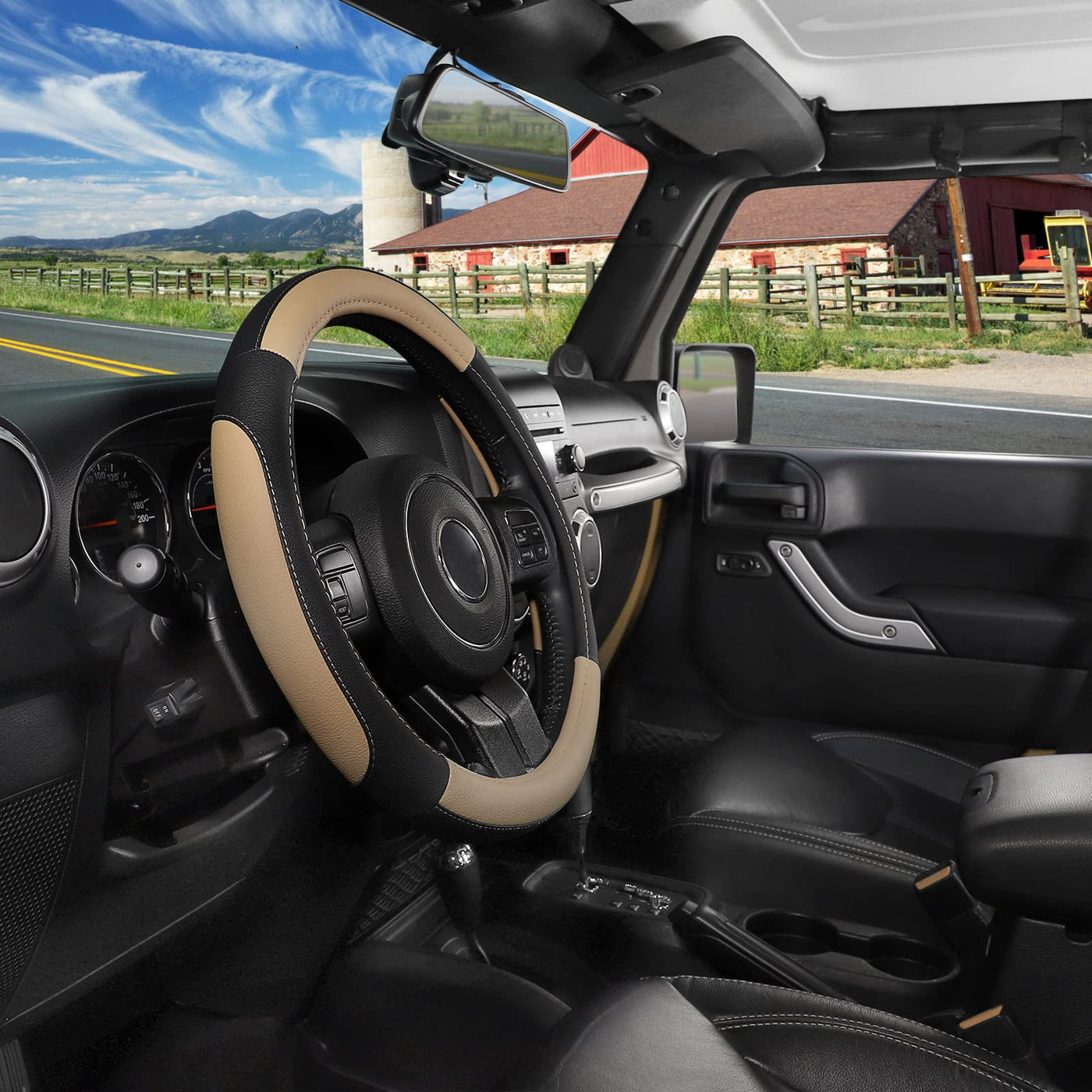 SEG Direct Car Steering Wheel Cover for F-150 Tundra Range Rover 15.5-16 inch, Black and Beige Microfiber Leather