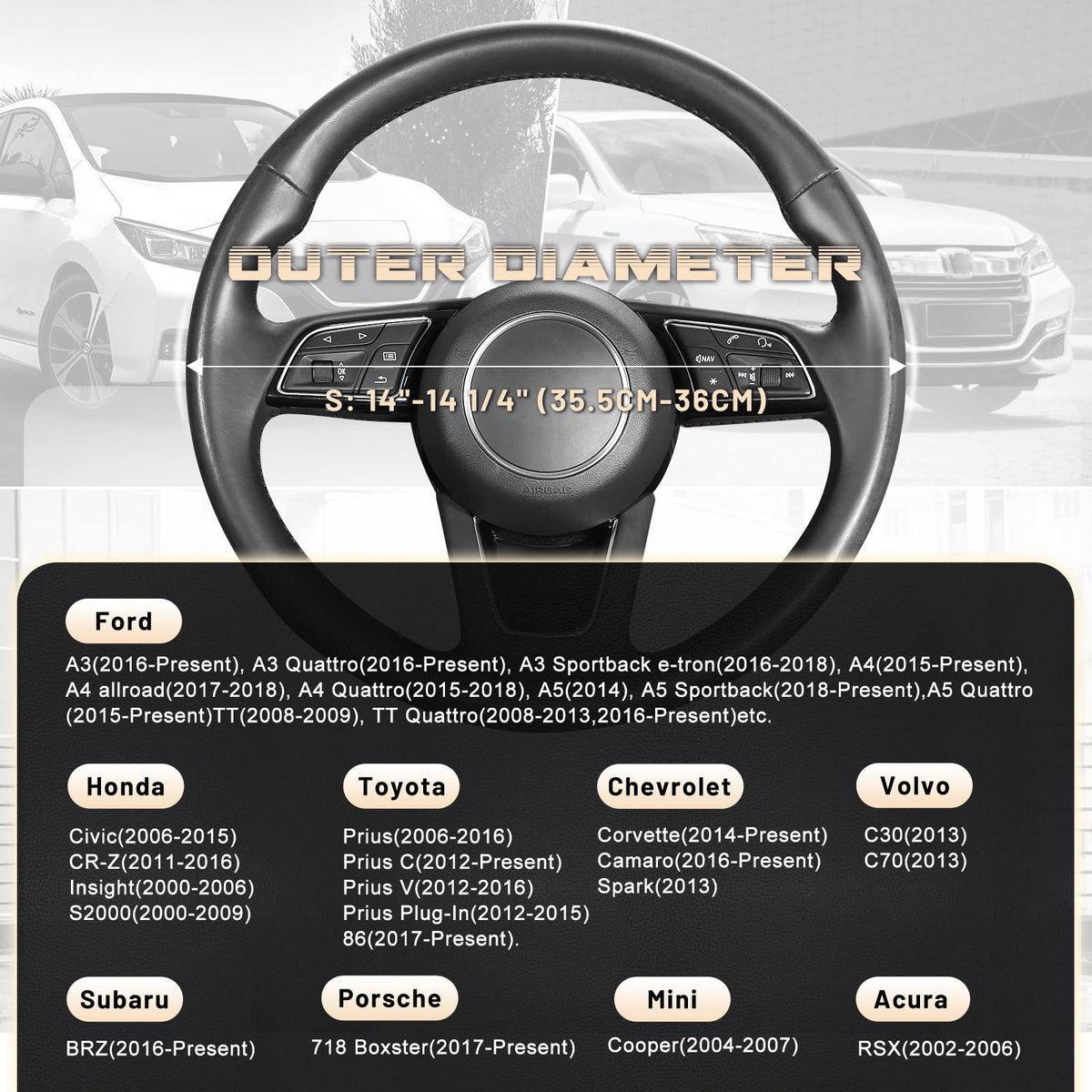 LEVEL UP YOUR CAR INTERIOR: The durable and easy-to-install steering wheel cover is the premier option for covering an old or worn original factory steering wheel. The delicate splicing design adds texture to the interior of your car. | HAND-SAVER: The fine and supple microfiber leather is much softer than factory-installed steering wheel. It provides a comfortable touch when driving, helps reduce driving fatigue, and brings you a pleasant driving experience. | NON-SLIP AND PROTECTION: Constructed from less slippery microfiber leather exterior and rubber lining, this car wheel cover adds secured safety performance when driving. It also protects your steering wheel from sunburn, scratches, fading, wear, and dirt. | NO MORE STICKY: The auto steering wheel cover is comfy to hold, it absorbs the hand-sweat that the summer heat causes, and allows you to grip the steering wheel much better. | READY TO INSTALL: Warm up the steering cover, and slip it on your steering wheel. Installation is fairly easy, any adult can install this steering wheel cover. Suitable for small size steering wheels with outer diameter of 14-14 1/4 inches, please carefully measure the size of your steering wheel before purchasing.