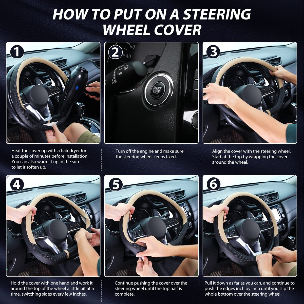 ?D Shape?Nowadays any cars come with a steering wheel that features a flat base that is fancy, sporty, more appealing, and more comfortable. SEG Direct D-type steering wheel covers are precisely designed for 14 1/2-15 inch flat bottom steering wheels. | ?Upgrade Your Car Interior?A worn and faded wheel can put a damper on driving enthusiasm. This durable and easy-to-install steering wheel cover is perfect for boosting the appearance of your cabin or hiding a worn or old steering wheel. | ?Hand-Saver?Crafted with delicate and breathable leatherette material, this soft wheel cover absorbs the hand sweat that the summer heat causes, allowing you to grip the steering wheel firmly. And it also helps reduce driving fatigue, and makes driving even more enjoyable. | ?Non-Slip?Constructed from less slippery microfiber leather exterior and rubber lining, this car wheel cover adds secured safety performance when driving. It also protects your steering wheel from sunburn, scratches, fading, wear, and dirt. | ?Ready to Install?Warm up the steering cover for munites, and slip it on your steering wheel. Installation is fairly easy, any adult can easily install this steering wheel cover.