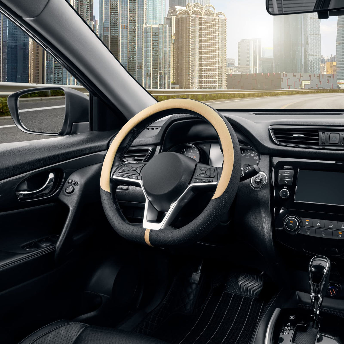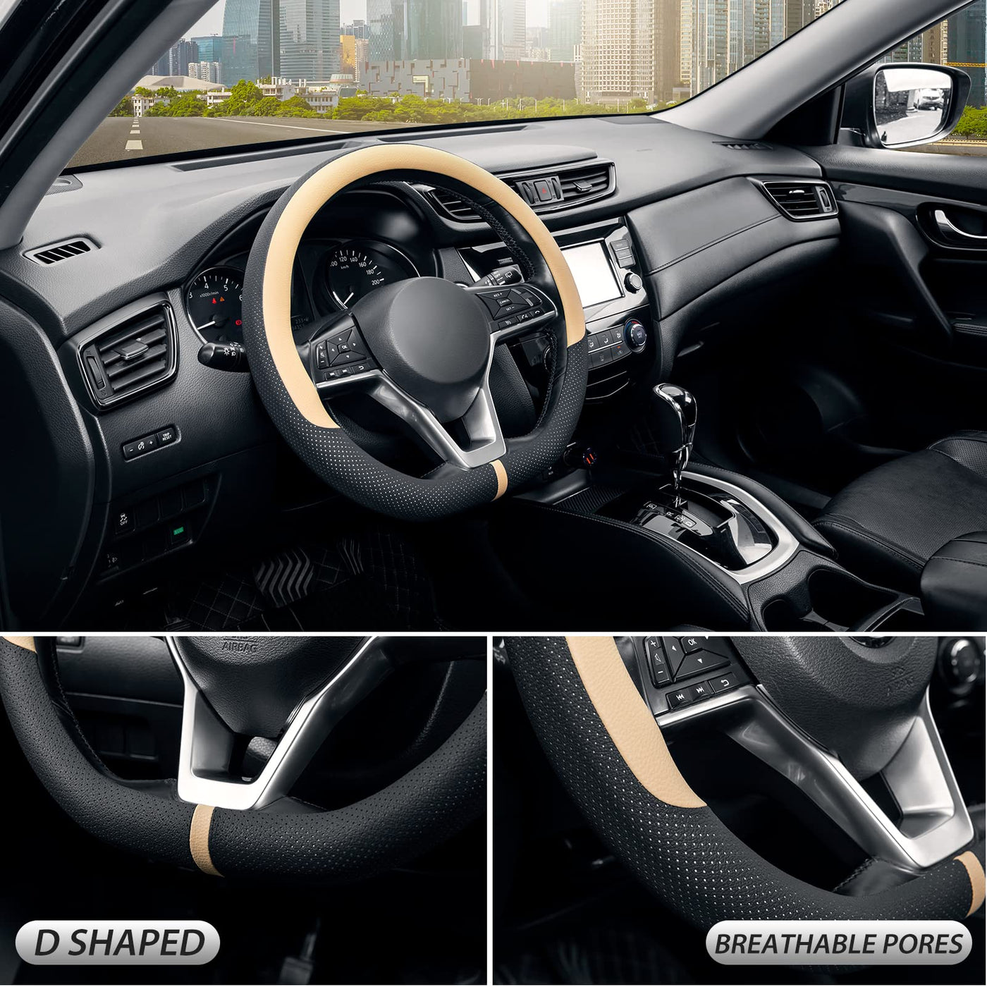 Seg Direct Flat Bottom Steering Wheel Cover Breathable, D Shaped Car Wheel Cover 14 1/2-15 In. (37-39 Cm), Black Beige Microfibe