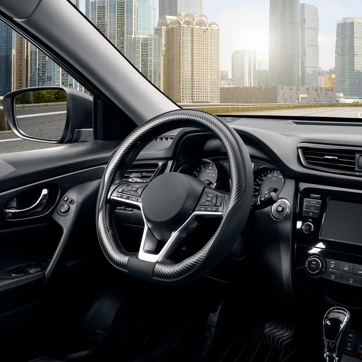 Seg Direct Flat Bottom Steering Wheel Cover Carbon Fiber, D Shaped Car Wheel Cover 14 1/2-15 In. (37-39 Cm), Black Microfiber Le