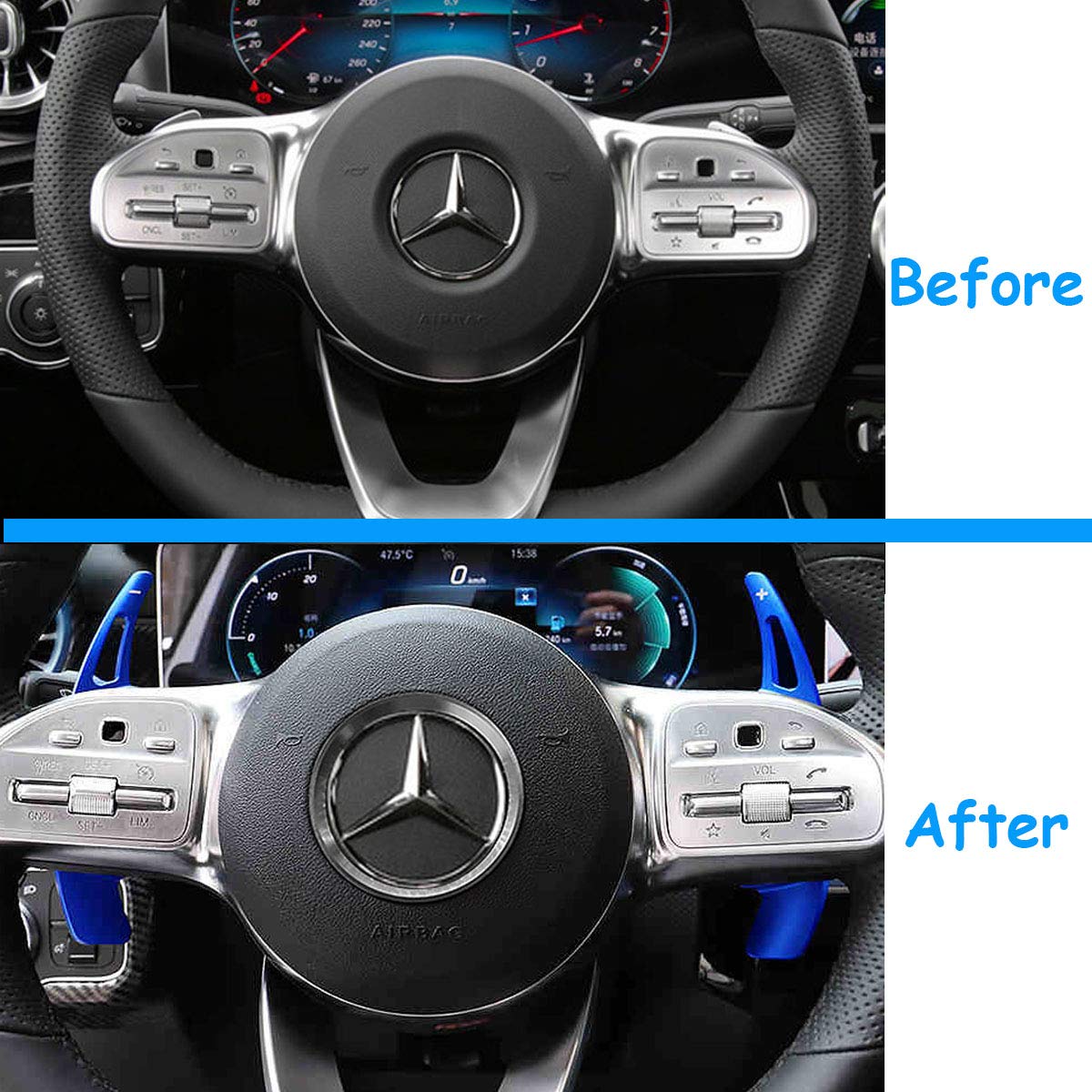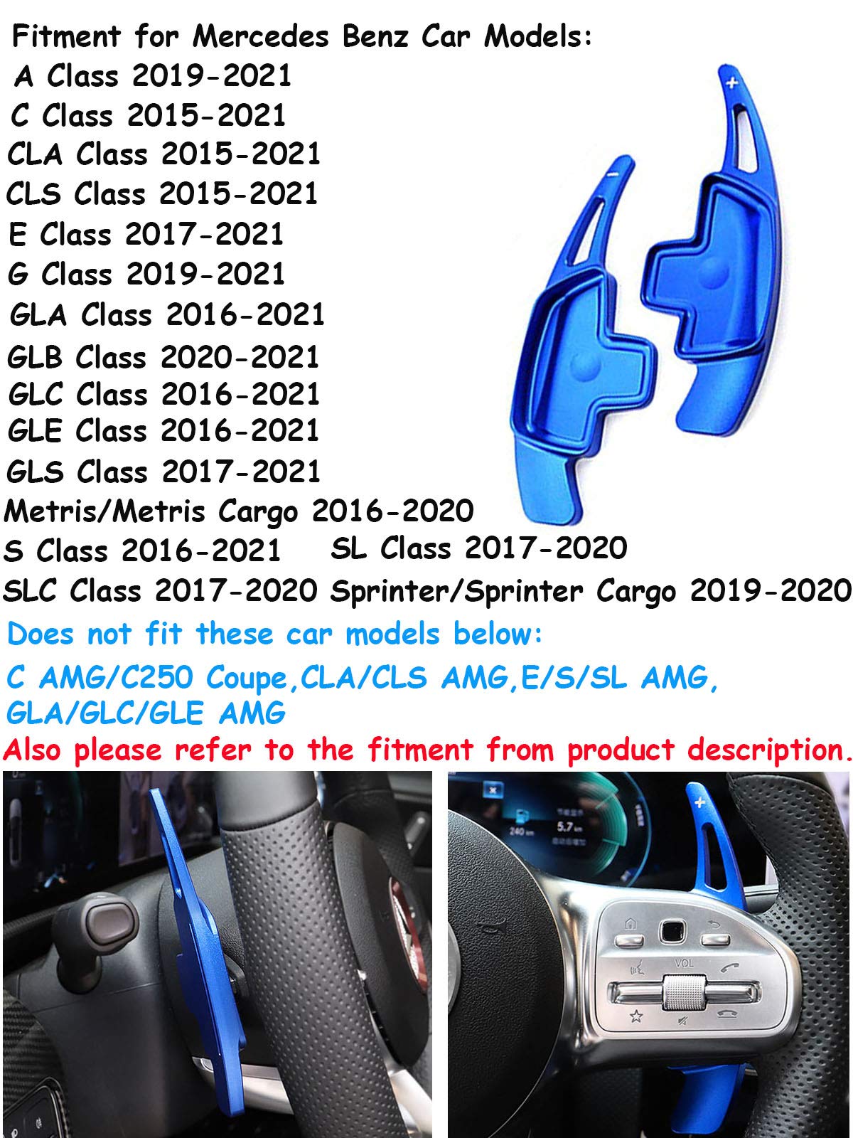 Note: Color:Blue Size: Length 15.3cm, Width 5.7cm Package Included: 1 pair Mercedes steering wheel paddle shifter (Left & Right), 1 pair 3M self-adhesive tapes and 1 pair adhesive enhancer. Warm Tips: Please remember to clean and tidy the overall of surface paddle, and you could use the adhesive enhancer we provided to strengthen the stability before installation.