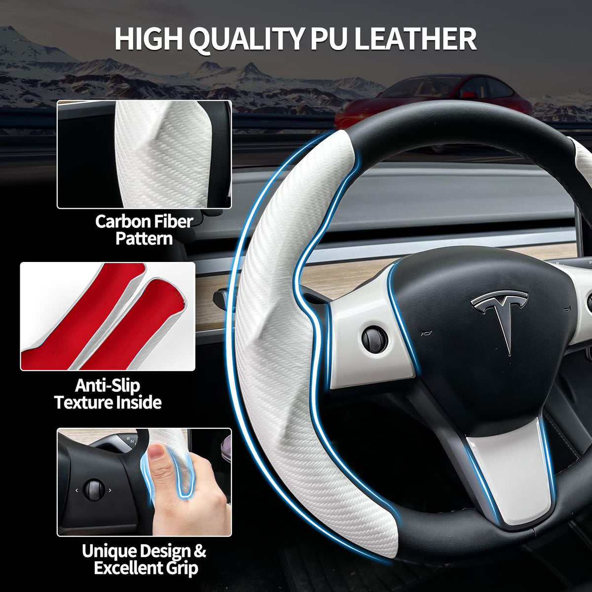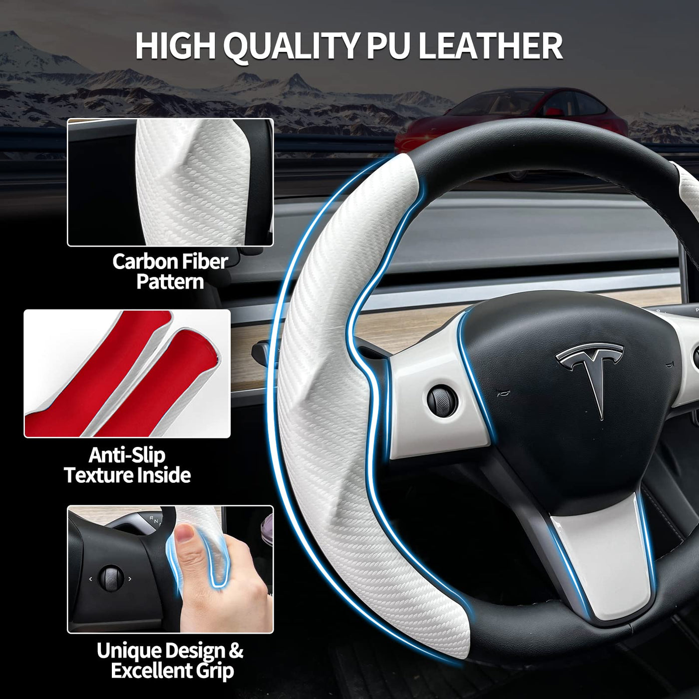 Q: What materials are used in the Uxcer Steering Wheel Cover?A: The Uxcer Steering Wheel Cover is made of high-quality carbon fiber and odorless PU leather, providing a comfortable grip and a stylish look for your Tesla.