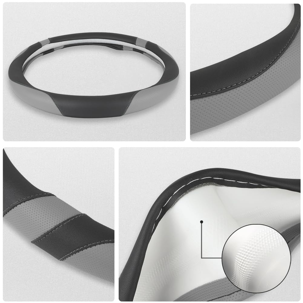 Q: Does the steering wheel cover provide a good grip for safe driving?A: Yes, the cover features a safe anti-skid design with a natural rubber inner ring. This design improves grip, enhancing your control over the steering wheel, which contributes to safer driving.