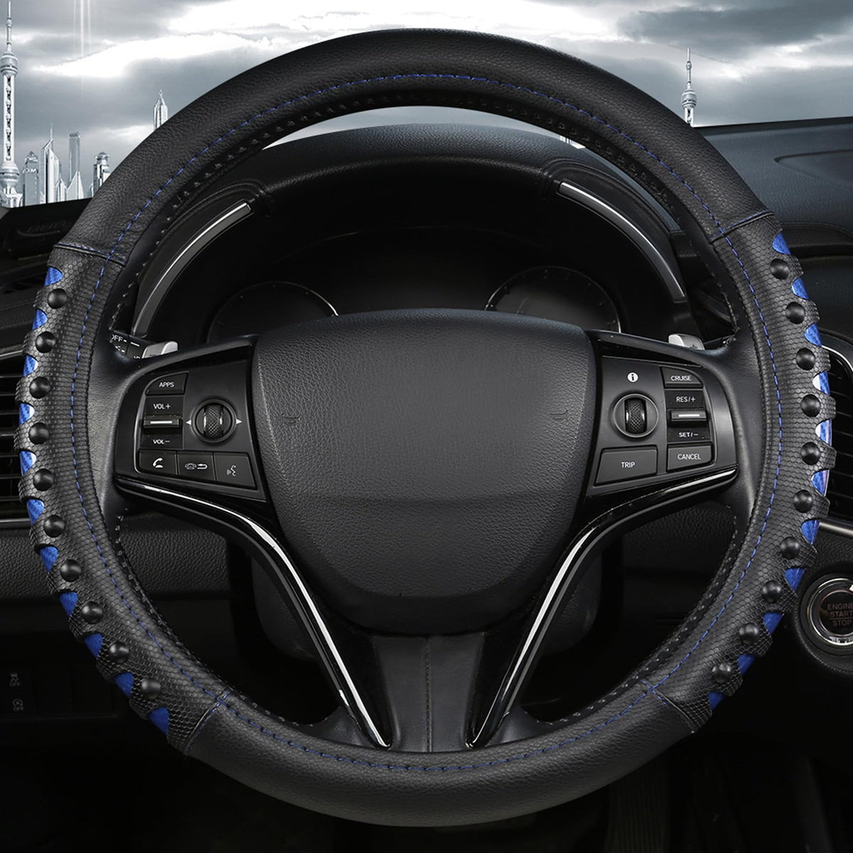West Llama car steering wheel cover adopts super anti-slip grip, makes you better control the steering wheel in any conditions. It universal fits medium-sized steering wheel of sedans, SUVs, vans and trucks. Please measure the outer diameter of your steering wheel before placing order. SPECIFICATION: - Style: Anti-slip leather nails and cutout design car steering wheel cover - Surface Material: Microfiber leather, PVC - Inner Material: Environment-friendly rubber layer - Size: 15.5-16 inches / 39-40 cm - Weight: 550 g/1.2 lbs Installation Steps: Step 1: Line the top of the steering wheel with the cover and cover the top. Step 2: Then pull tight the steering wheel cover from top to side and side to bottom. (Note: The cover fits snugly, you might need help from others.) Step 3: Fix the bottom of steering wheel cover and adjust it. Tips: (For easy installation, please warm up the steering wheel cover in the sunlight or with a hair dryer for a while.) Kindly Note: - There might be slight color deviation due to display difference.