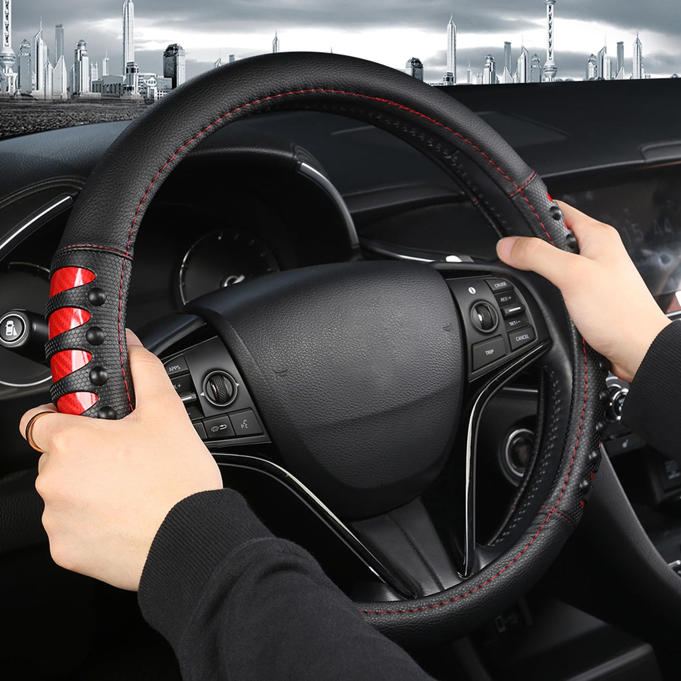 West Llama car steering wheel cover adopts super anti-slip grip, makes you better control the steering wheel in any conditions. It universal fits medium-sized steering wheel of sedans, SUVs, vans and trucks. Please measure the outer diameter of your steering wheel before placing order. SPECIFICATION: - Style: Anti-slip leather nails and cutout design car steering wheel cover - Surface Material: Microfiber leather, PVC - Inner Material: Environment-friendly rubber layer - Size: 15.5-16 inches / 39-40 cm - Weight: 550 g/1.2 lbs Installation Steps: Step 1: Line the top of the steering wheel with the cover and cover the top. Step 2: Then pull tight the steering wheel cover from top to side and side to bottom. (Note: The cover fits snugly, you might need help from others.) Step 3: Fix the bottom of steering wheel cover and adjust it. Tips: (For easy installation, please warm up the steering wheel cover in the sunlight or with a hair dryer for a while.) Kindly Note: - There might be slight color deviation due to display difference.