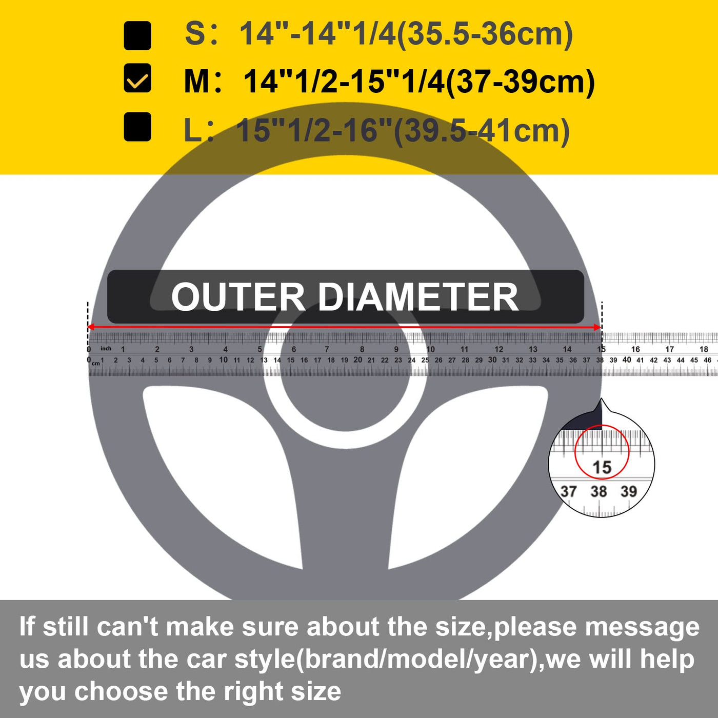Universal Size: Suitable for all medium-sized steering wheels with a diameter of 14 1/2 inch to 15 inch (37 cm to 39 cm). If you are not sure whether your steering wheel is suitable, please contact us, we provide 24 hours service. | Quality Material: This steering wheel cover made of top quality leather. The soft leather material not only protects your steering wheel, but also provides you with excellent touch and relieves driving fatigue. | Fashion and Charming Design:The diamond steering wheel cover gleams under the light, very charming and attractive. Adding a sense of luxury to your car interior. The surface is covered with gorgeous rhinestones to massage your palm, Xizopucy always care for the health of your palms. Best choice for women and girls. | Escorting Your Safety: The surface of the steering wheel cover has non-slip line design, which can increase the friction between the palm and the steering wheel cover, it can better control the direction even when driving on rough roads. The specially designed inner ring can absorb vibration and provide better grip, it will protect and avoid stimulating your heart when the car violent shaking of the vehicle. | Easy Installation:You can heat the car wheel cover in the sun or with a hair dryer, place the cover on the top of the steering wheel and use both hands to slowly tighten it on both sides until it fits perfectly with the steering wheel. Flexible disassembly, won't affect the daily cleaning of your car, which will help improve your health and living standards.