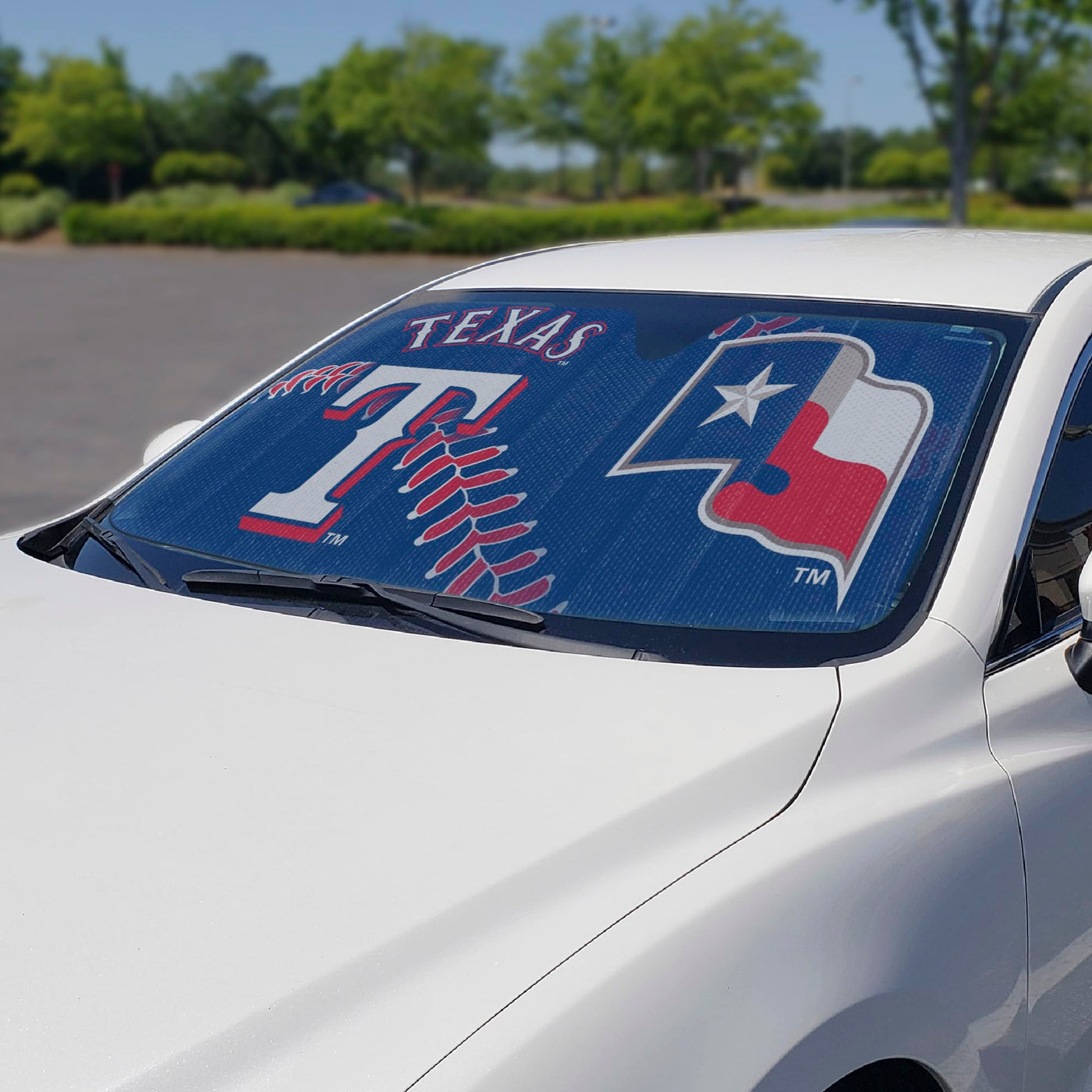 Q: Is the FANMATS sunshade officially licensed, and what team design is available?A: Yes, the FANMATS sunshade is officially licensed and features a colorful team design representing the Texas Rangers, making it a great accessory for fans.