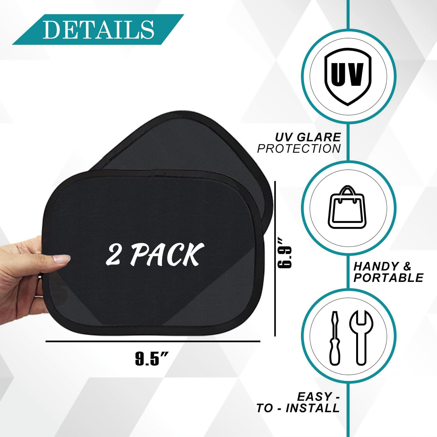 Description: 1. Our car window shades measure 9.5 x 6.9, perfect for the front windscreen without obstructing visibility. They're compact, portable, and can be easily used whenever necessary. 2. Featuring a static cling design, these window stickers leave no adhesive residue, ensuring easy cleaning and replacement. They adhere effectively to glass surfaces without requiring additional adhesives or glue. 3. Installation and relocation are a breeze. Simply wipe the windows clean, place the shades where needed, and you're done. They can be removed and re-applied without leaving residue or causing damage. 4. There are multiple ways to utilize these shades. Whether it's shielding your child from the sun next to their seat or blocking sunlight above a mobile phone holder for easy map checking, they're versatile. They can be used not only in cars but also anywhere sun blocking is required. 5. Enhance your driving safety by blocking harsh sunlight. This ensures the driver isn't affected by glare, maintaining clear vision and safe driving. They're suitable for use on the driver's side window, back/rear window, or seat side window for sun protection. Features: Package Included: 2 Pack Color: Black Size: 9.5L x 6.9W Closure Type: Static Cling Use location: Windshield & Side Window & Rear Window Fit for Car Type: Universal