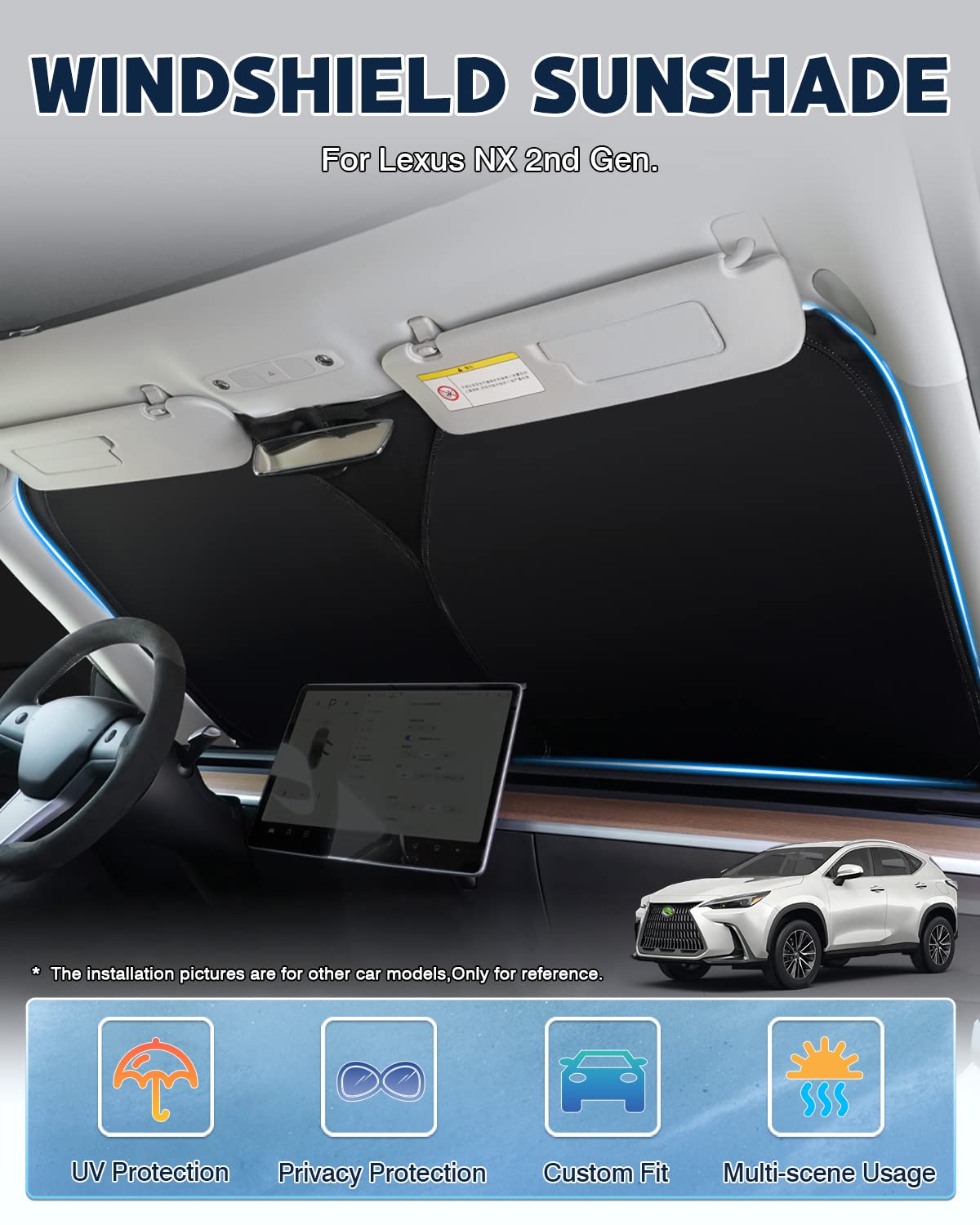 Q: Is the Karltys Windshield Sun Shade compatible with all Lexus NX models?A: The Karltys Windshield Sun Shade is specifically designed to fit only the 2022-2025 Lexus NX models, including NX250, NX350, NX350h, and NX450h+. It provides a custom fit, ensuring full coverage without any gaps.