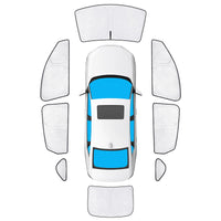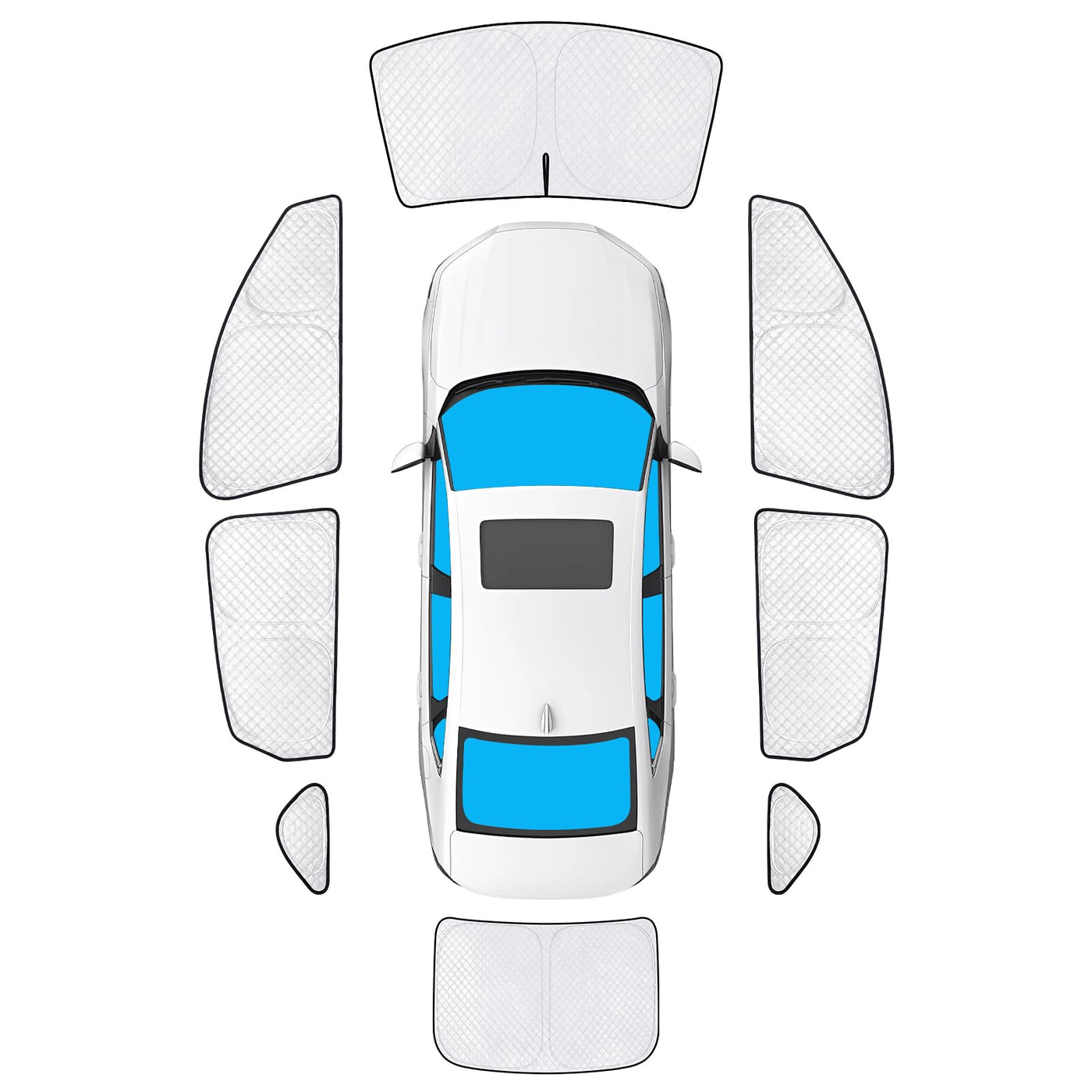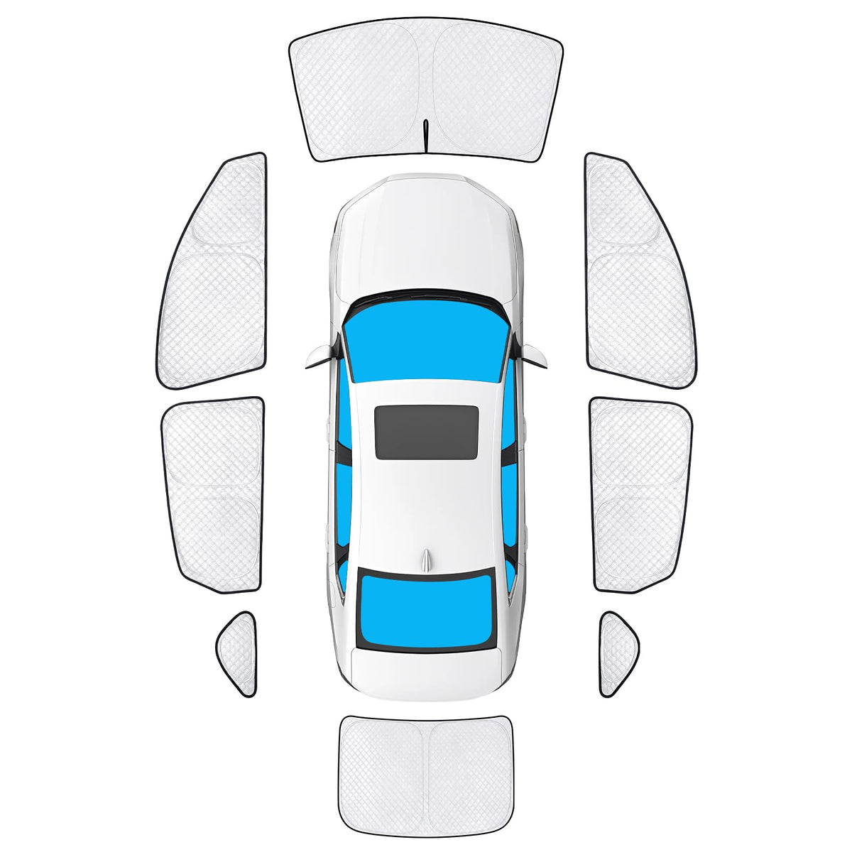 Q: What is included in the KMF Windshield Sun Shade set?A: The set includes 8 pieces for full coverage of your front, side, and rear windows, ensuring maximum protection against sunlight and privacy.
