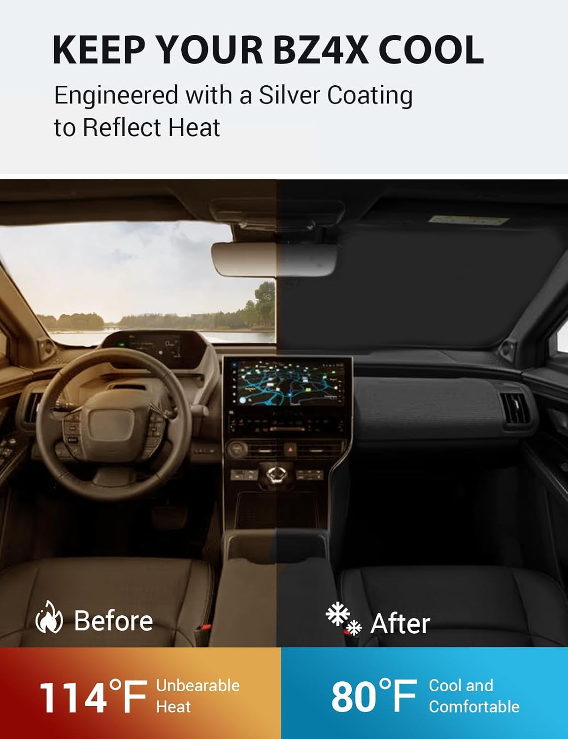 Designed in USA!!! Custom Fit: Our Proadsy front windshield shade is precisely cut for Toyota bZ4X, featuring reinforced steel rings for a precise and secure fit that doesn 't require suction cups. Unlike other car heat shields, it won 't sag or collapse, ensuring it is a perfect fit for 2023-2024 2025 Toyota bZ4X.