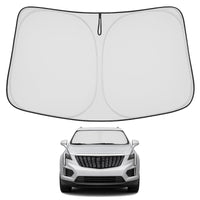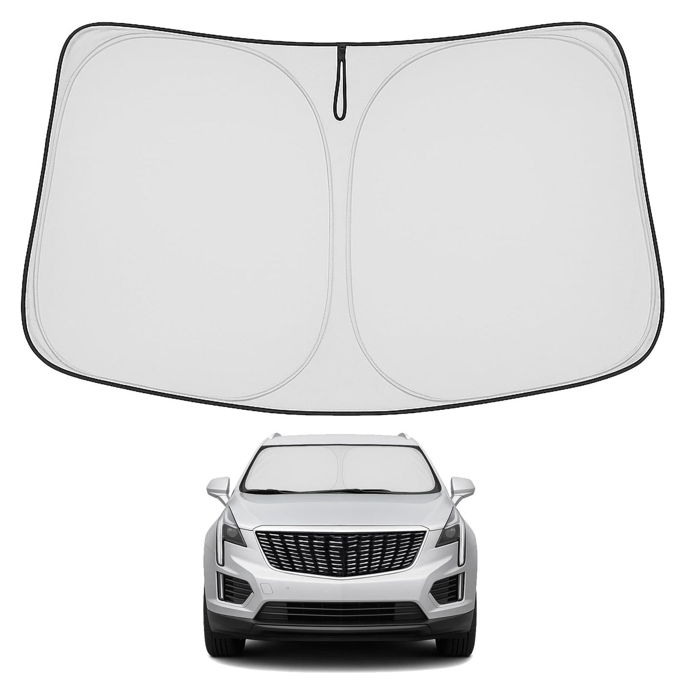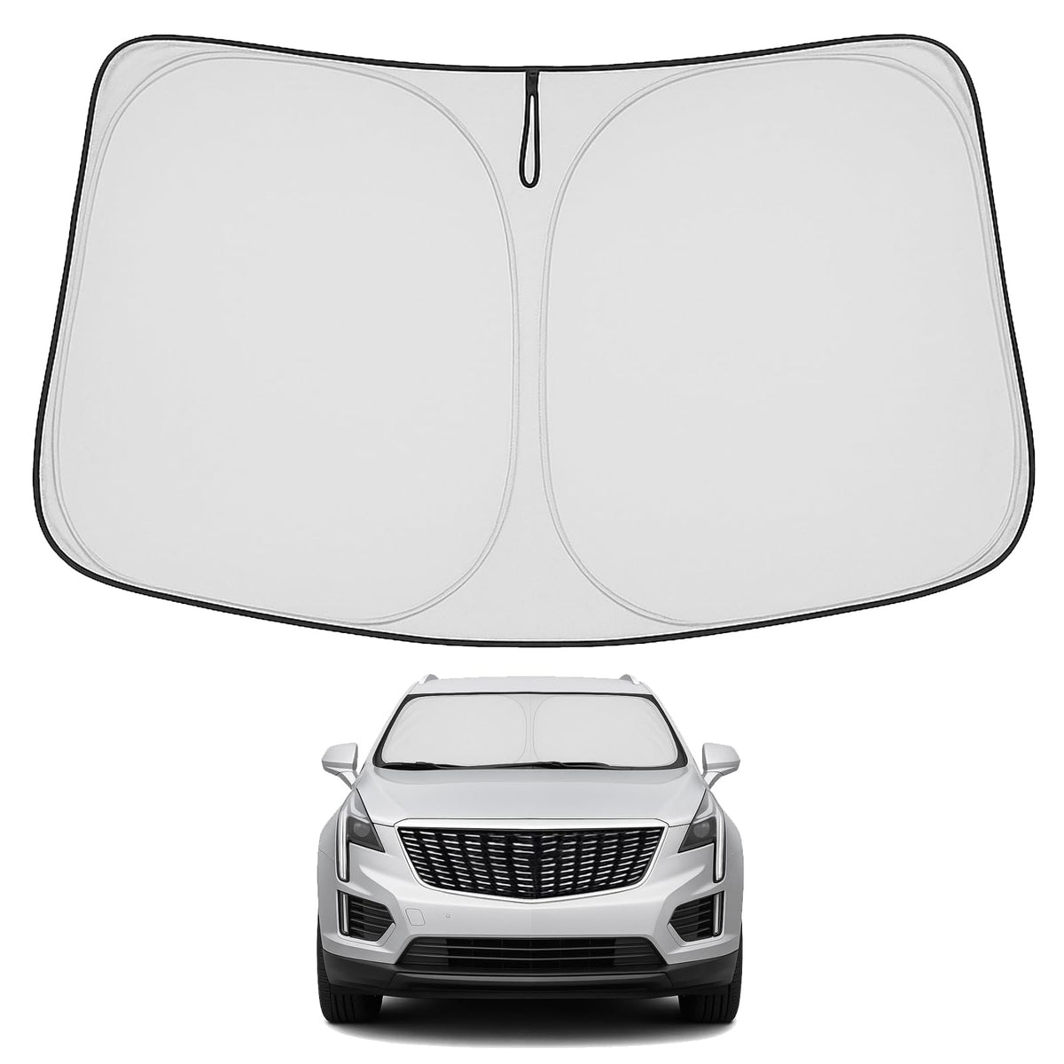 DESIGNED IN USA!!! Custom Design: The front windshield shade has been custom cut specifically for Cadillac XT5. Precise fit design and Reinforced steel rings make a precise and secure fit to the window, no need to use suction cups to hold it in place. It won 't sag or collapse like other car heat shields. Fits all Cadillac XT5 2017 2018 2019 2020 2021 2022 2023 2024 2025.
