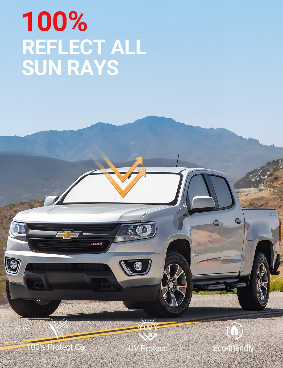 DESIGNED IN USA!!! Custom Design: The front windshield shade has been custom cut specifically for Chevrolet Colorado. Precise fit design and Reinforced steel rings make a precise and secure fit to the window, no need to use suction cups to hold it in place. It won 't sag or collapse like other car heat shields. Fits all 2015-2022 Chevrolet Colorado Pickup Truck.