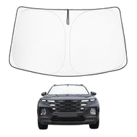 DESIGNED IN USA!!! Custom Design: The front windshield shade has been custom cut specifically for Hyundai Santa Cruz. Precise fit design and Reinforced steel rings make a precise and secure fit to the window, no need to use suction cups to hold it in place. It won 't sag or collapse like other car heat shields. Fits all 2022-2024 2025 Hyundai Santa Cruz.
