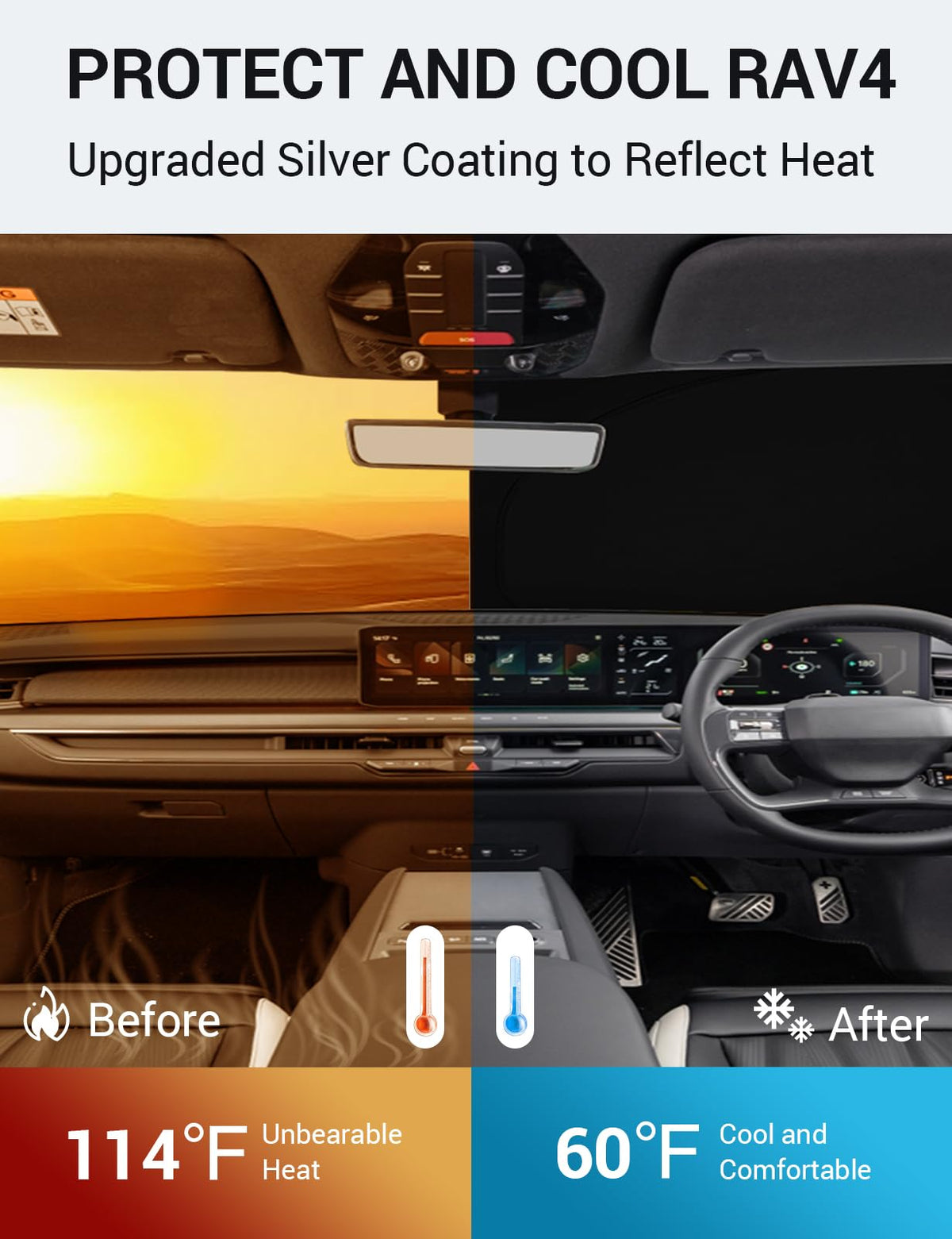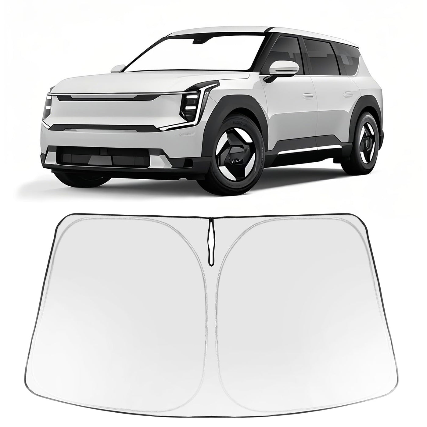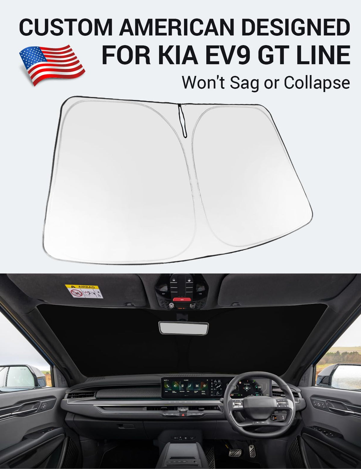 DESIGNED IN USA!!! Custom Design: The front windshield shade has been custom cut specifically for Kia EV9 GT Line. Precise fit design and Reinforced steel rings make a precise and secure fit to the window, no need to use suction cups to hold it in place. It won 't sag or collapse like other car heat shields. Fits for Kia EV9 2025 2024