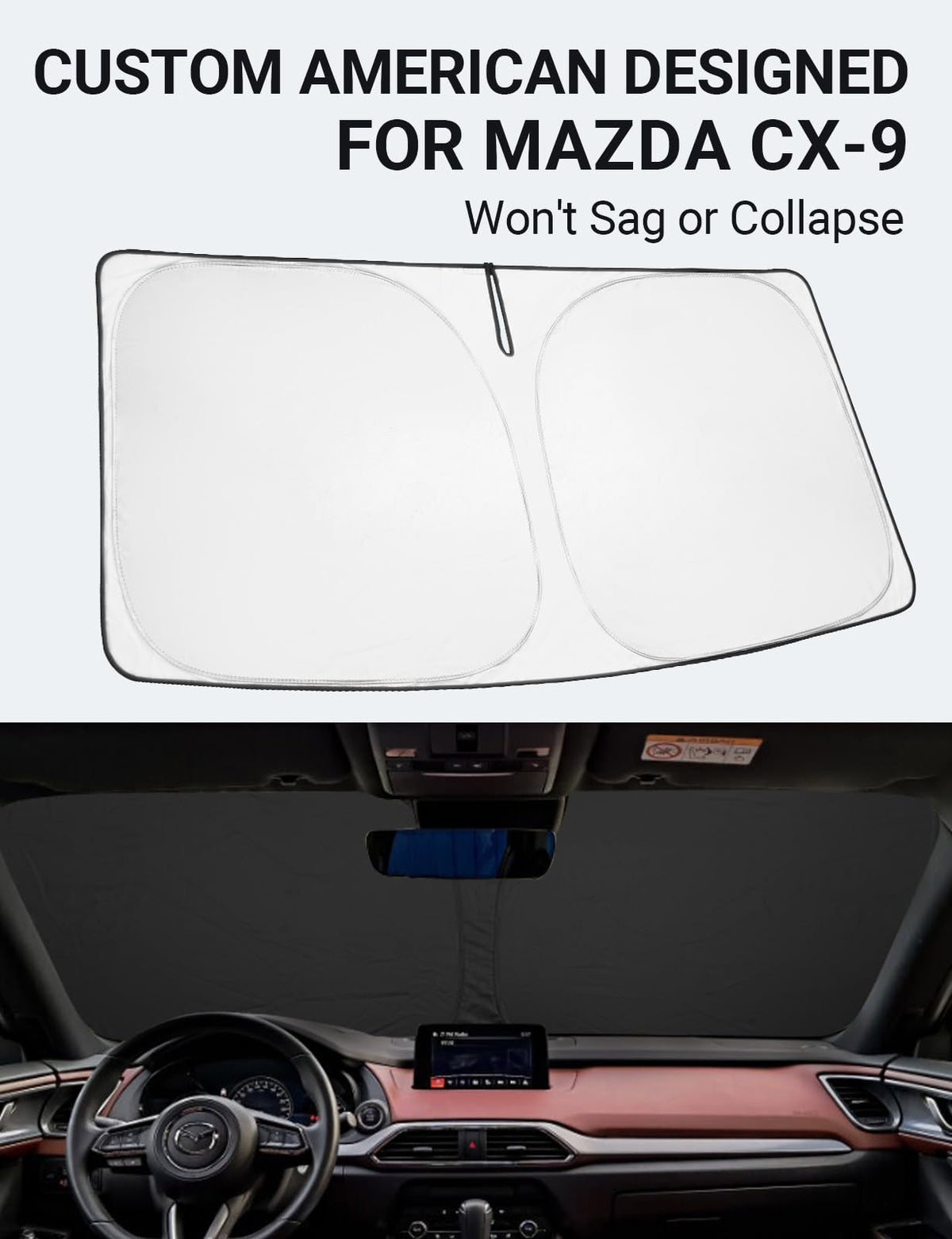 DESIGNED IN USA!!! Custom Design: The front windshield shade has been custom cut specifically for Mazda CX-9. Precise fit design and Reinforced steel rings make a precise and secure fit to the window, no need to use suction cups to hold it in place. It won 't sag or collapse like other car heat shields. Fits all Mazda CX9 2016 2017 2018 2019 2020 20212022 2023 2024 2025.