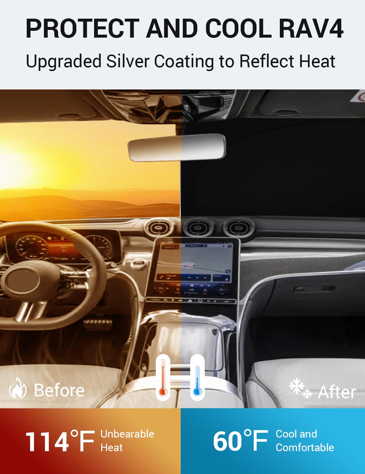 DESIGNED IN USA!!! Custom Design: The front windshield shade has been custom cut specifically for Benz GLC. Precise fit design and Reinforced steel rings make a precise and secure fit to the window, no need to use suction cups to hold it in place. It won 't sag or collapse like other car heat shields. Fits for Benz GLC 2025 2024 2023