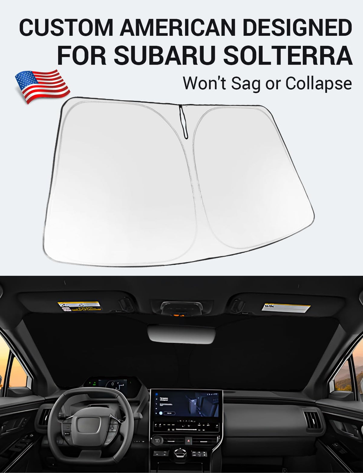 DESIGNED IN USA!!! Custom Design: The front windshield shade has been custom cut specifically for Subaru Solterra. Precise fit design and Reinforced steel rings make a precise and secure fit to the window, no need to use suction cups to hold it in place. It won 't sag or collapse like other car heat shields. Fits for Subaru Solterra 2025 2024 2023