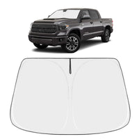 DESIGNED IN USA!!! Custom Design: The front windshield shade has been custom cut specifically for Tundra. Precise fit design and Reinforced steel rings make a precise and secure fit to the window, no need to use suction cups to hold it in place. It won 't sag or collapse like other car heat shields. Fits for Tundra 2007 2008 2009 2010 2011 2012 2013 2014 2015 2016 2017 2018 2019 2020 2021 | Upgrades Design Sunshade: The toyota tundra sun shade boasts a double layer of heat shield fabric to keep out the sun. The first layer is premium 210T reflective polyester and the second layer is high-quality fabric. Double insulation, and double protection. The best shade and insulation on the market | Easy to Use and Store: Unlike other products on the market, We use a Lightweight collapsible car window sun shade design. The windscreen sunshade can be easily popped up and folded in seconds for daily use. You can easily tuck the car sun visor protector into your door pocket | Keeps Cool: Engineered with a silver coating to reflect heat, reducing heat buildup by up to 40