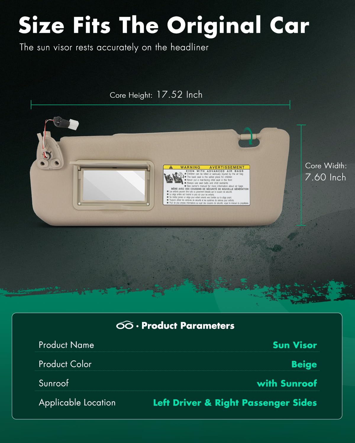 [Applicable models]:For Hyundai Sonata 2005-2008 | [Replaces Part Number]:852013K400QS.This aftermarket direct replacement is exactly the same as the original visor, made with the same quality and from the same materials. | [Durable Material]: The visor is made of soft material, which is comfortable and durable to the touch and easy to clean. The sun visor can withstand prolonged sun exposure | [Smooth and Stable]: The sun visor can be rotated smoothly and fixed in position, without falling and swinging at will, allowing you to have a pleasant driving experience. | [Easy Installation]- The SCITOO visor can be installed quickly, simple operation without other tools.